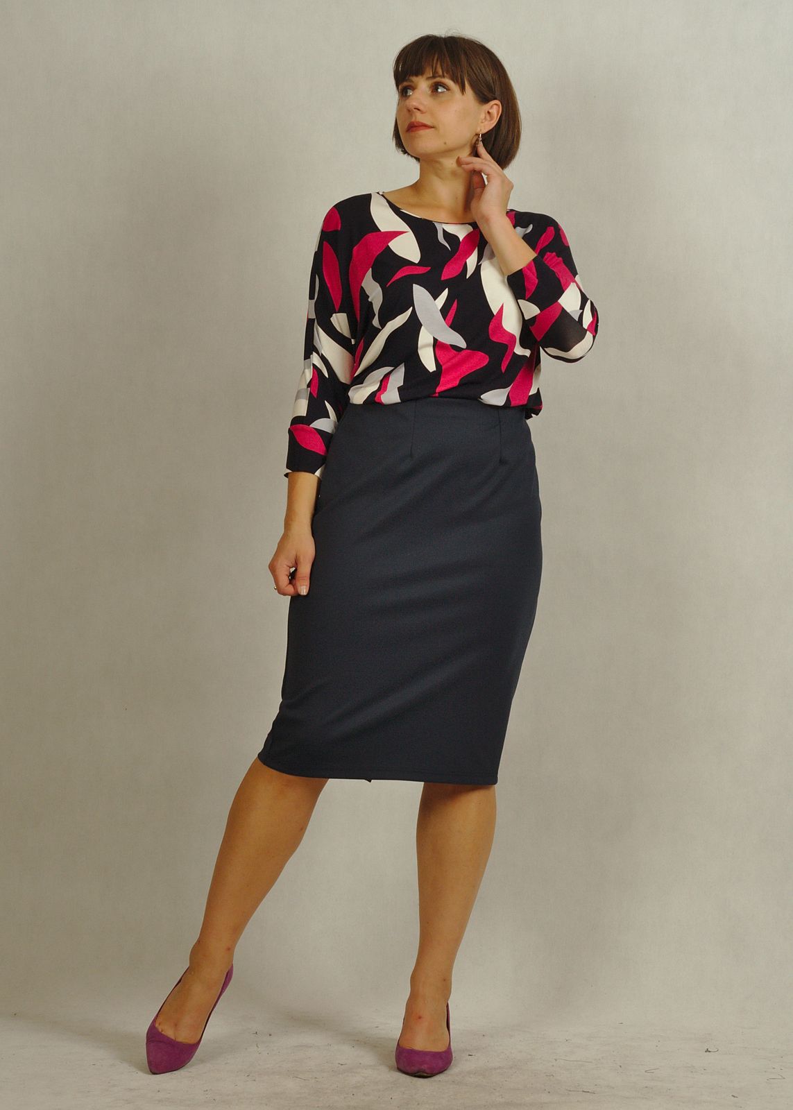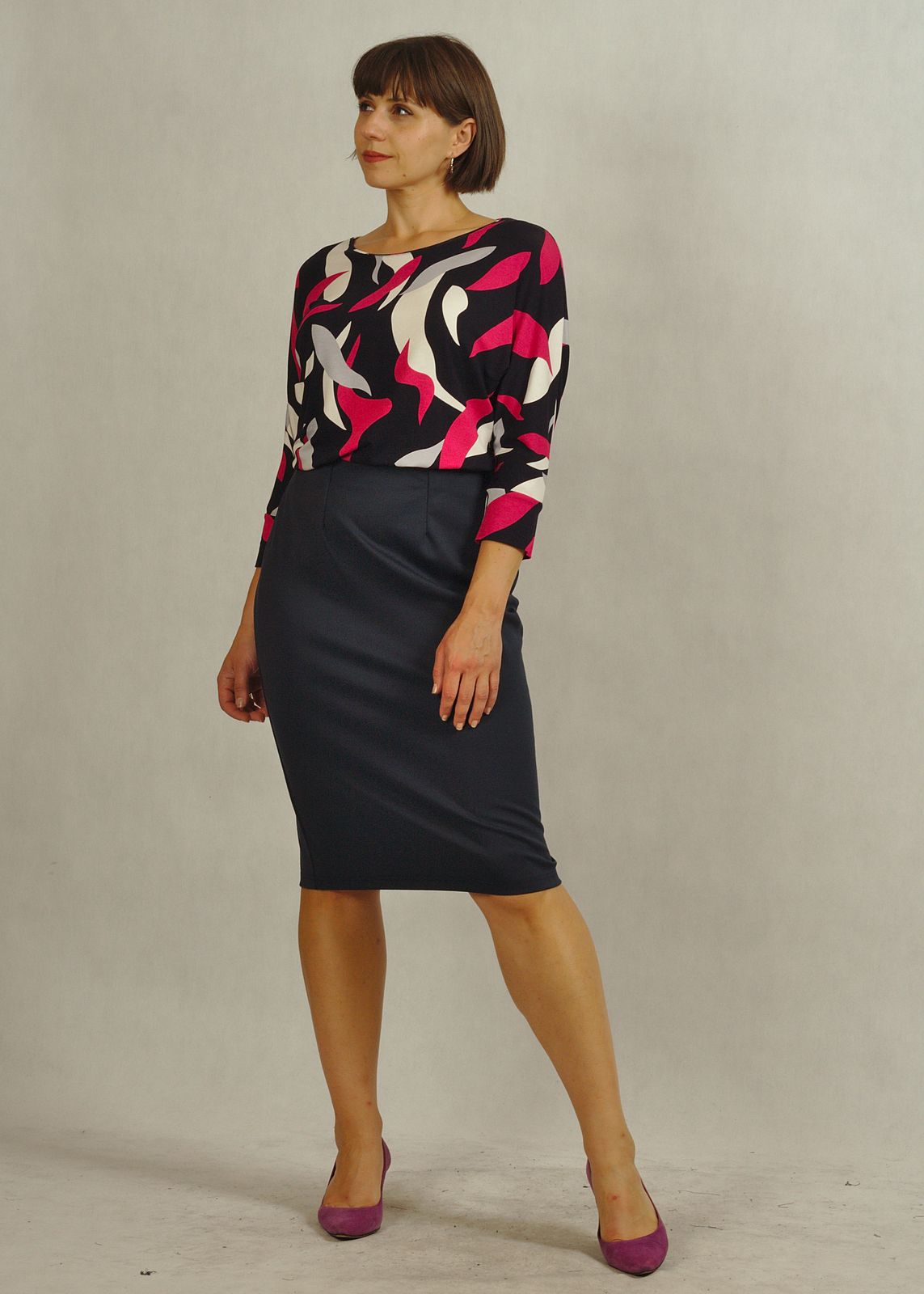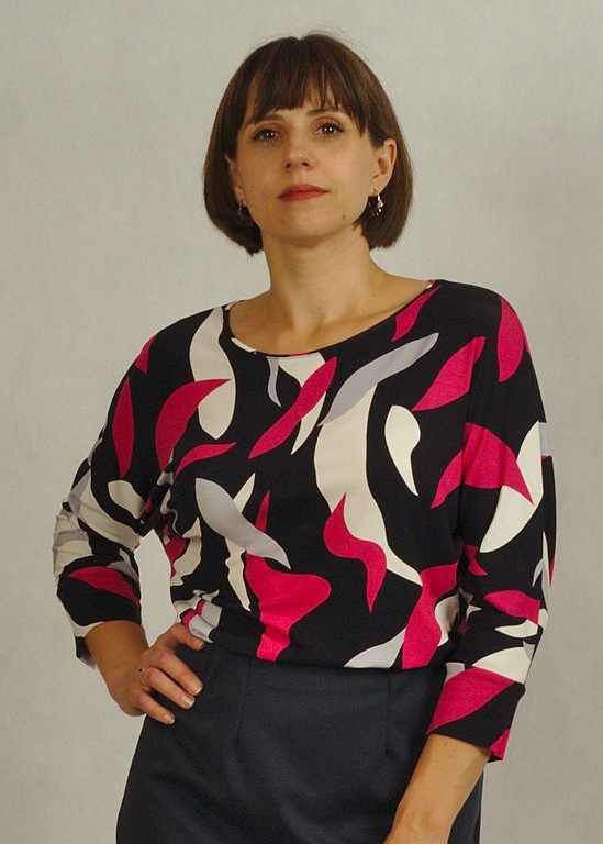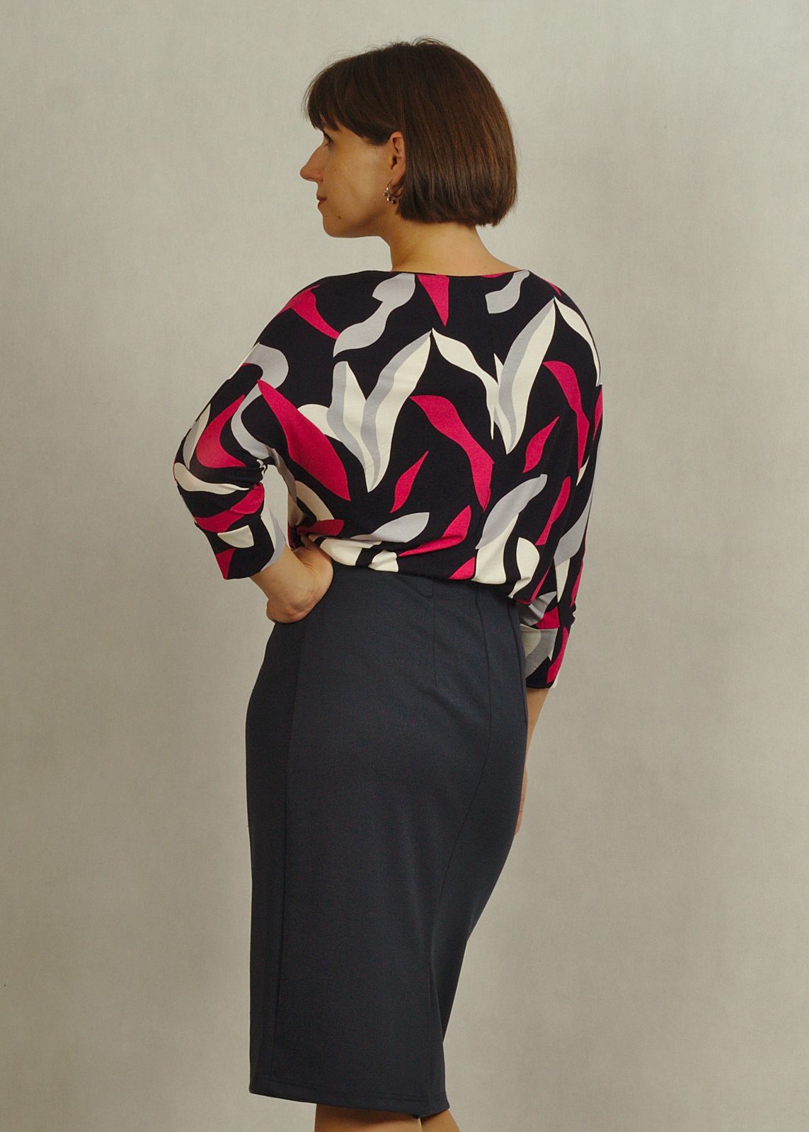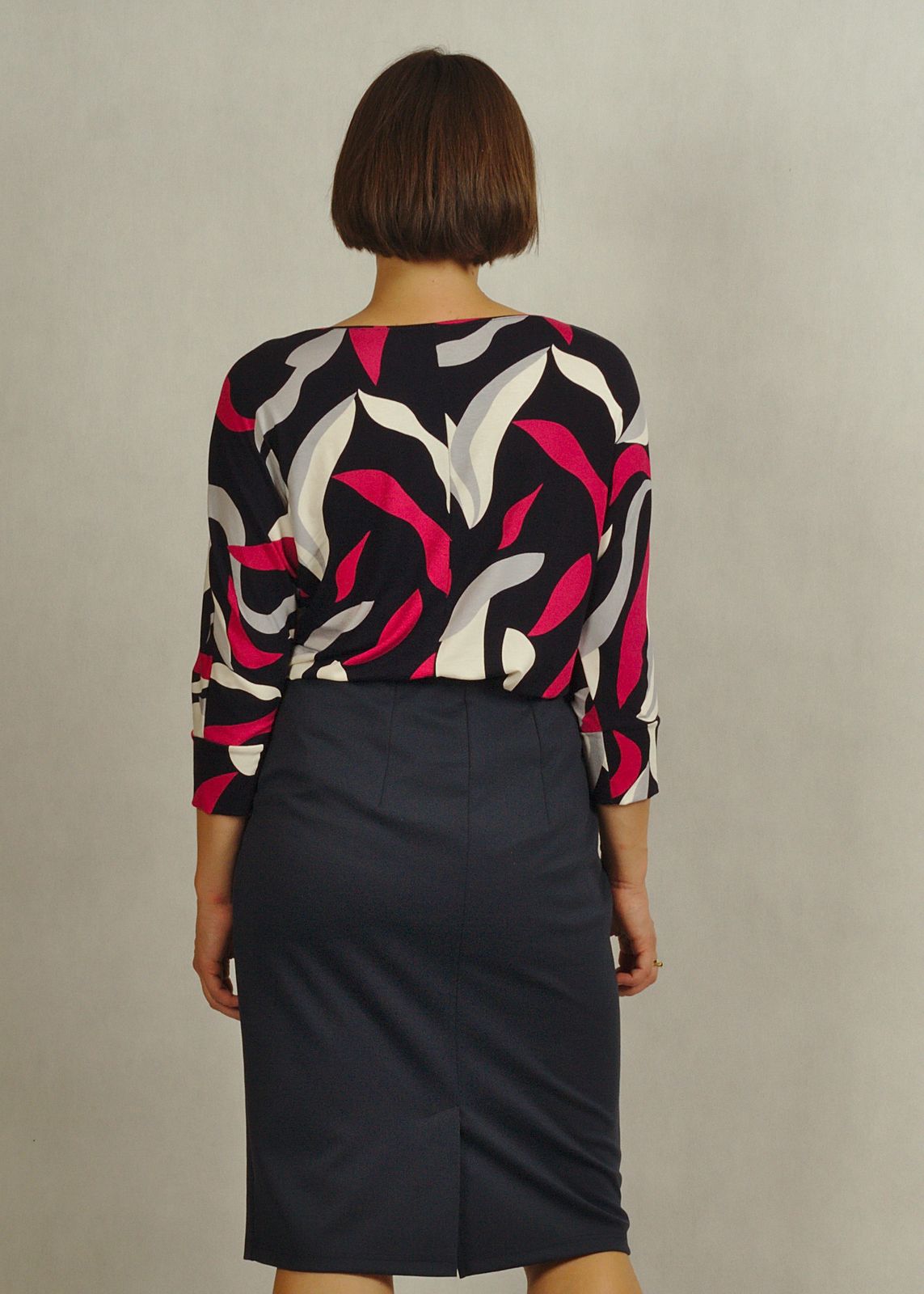 Bluzka we wzory posiada półokrągły dekolt. Rękaw 3/4 kimono z mankietem, tzw.’ nietoperz’ daje swobodę w użytkowaniu.