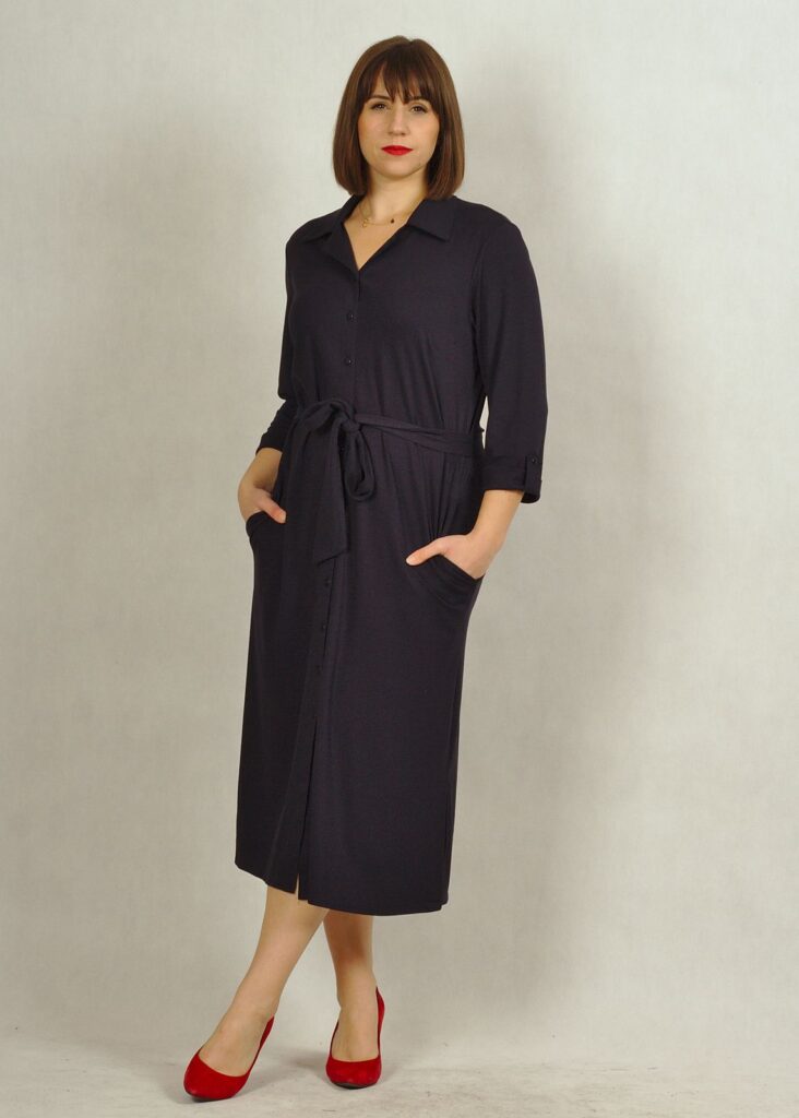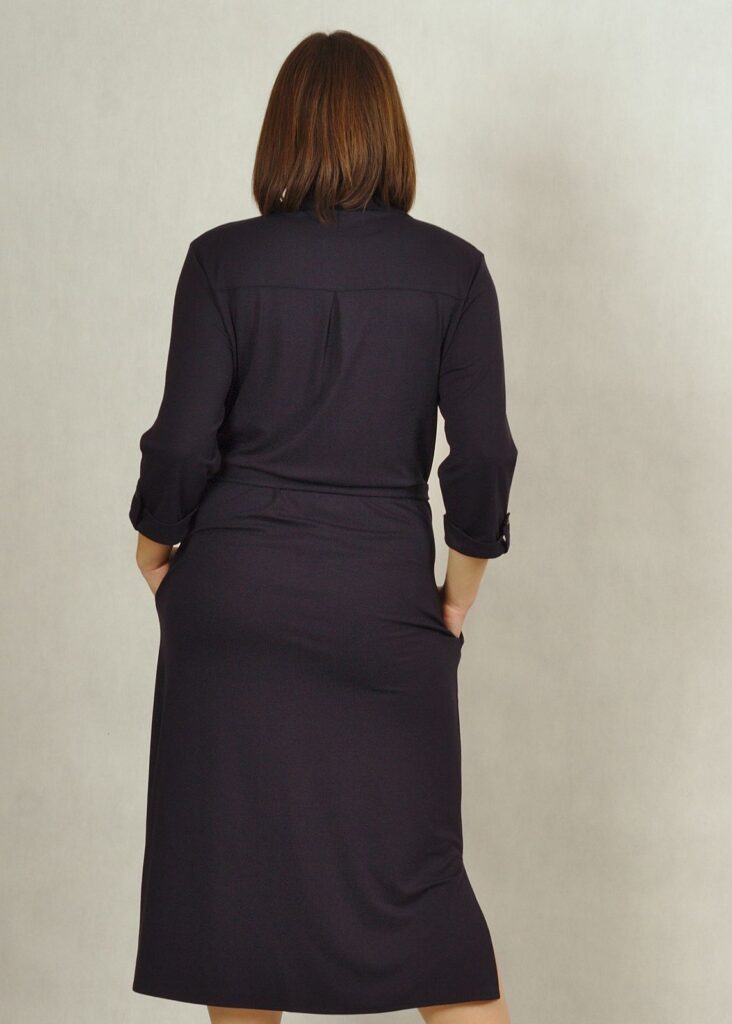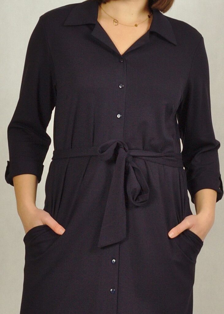 Sukienka z guzikami wygląda bardzo klasycznie. Dekolt pięknie odkryty kołnierzykiem.