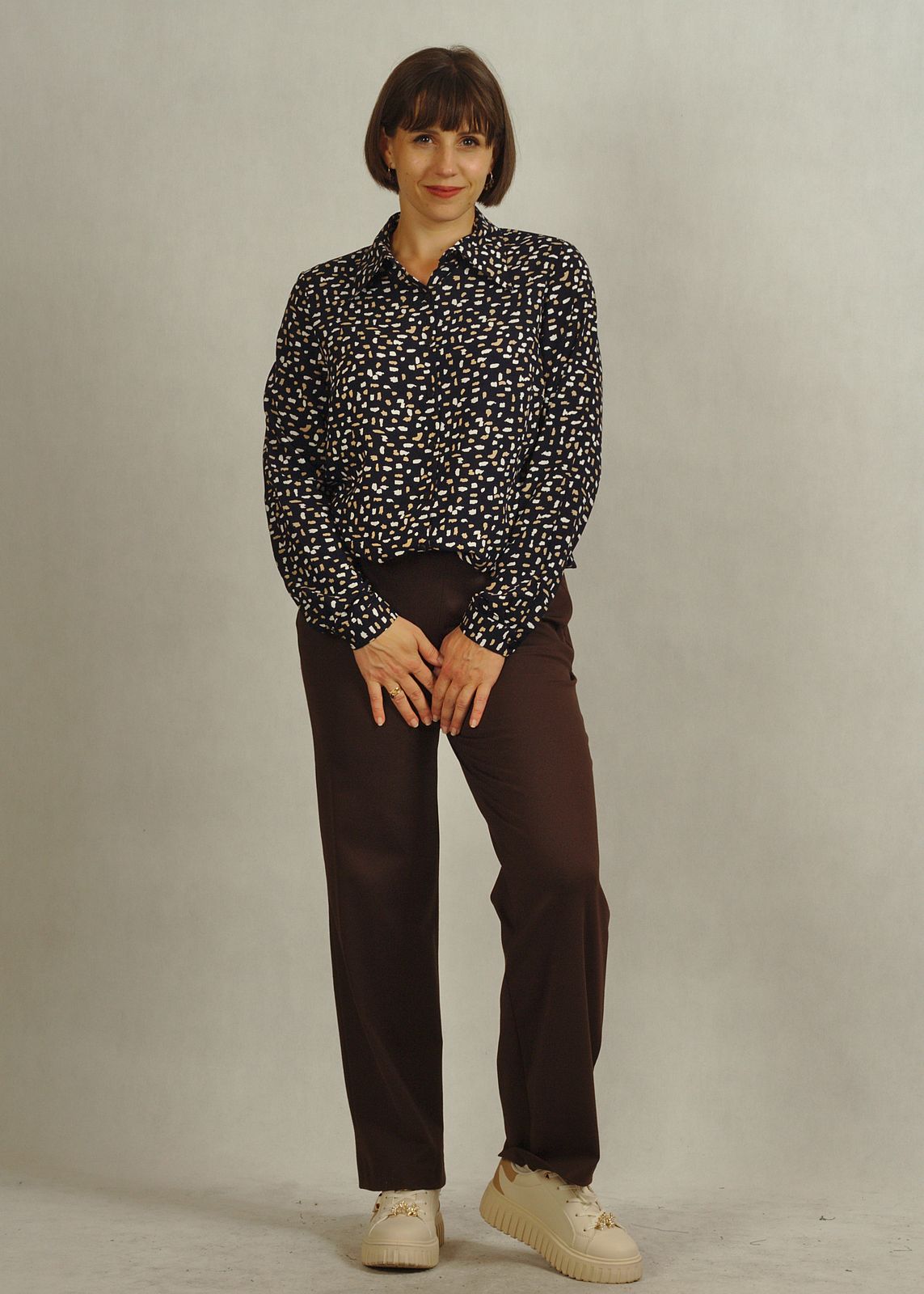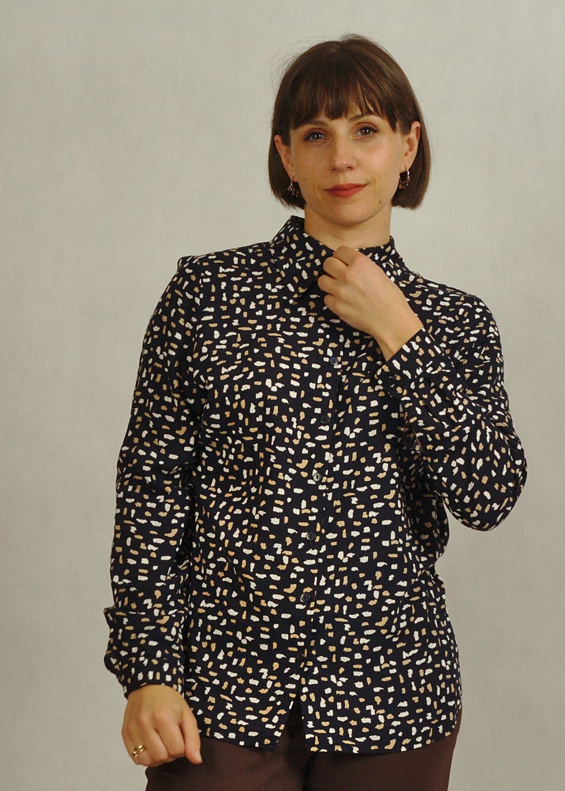 Koszula w drobne beżowe i białe wzorki – dodają jej niecodziennego charakteru.