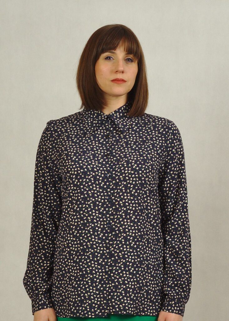Bluzka  z kołnierzykiem – zapinana jest na drobne granatowe guziczki i przy dekolcie wykończona pięknym kołnierzykiem.