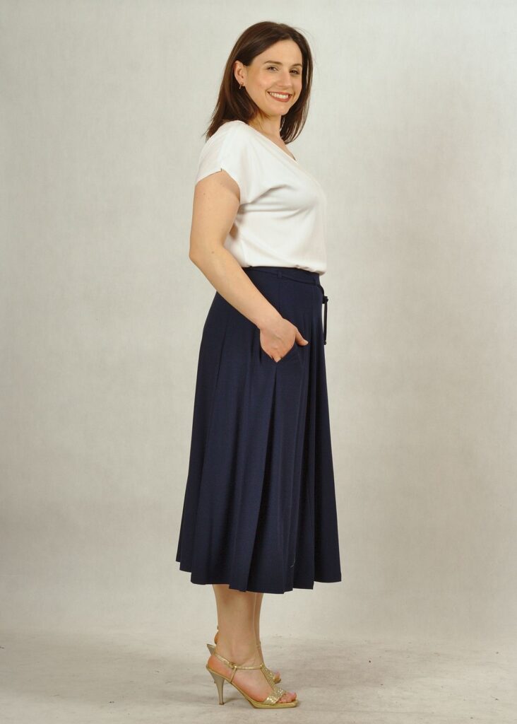 Fason spódnicy ku dołowi delikatnie rozszerza się. Pięknie kryje niedoskonałości w okolicach bioder.