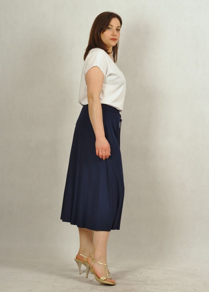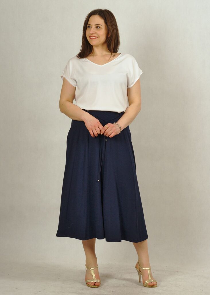 Długość bardzo modna i wygodna, do połowy łydki. Dopasujesz do niej trampki, buty na obcasie lub letnie sandałki.