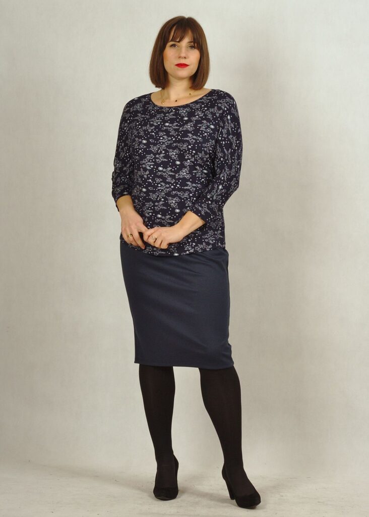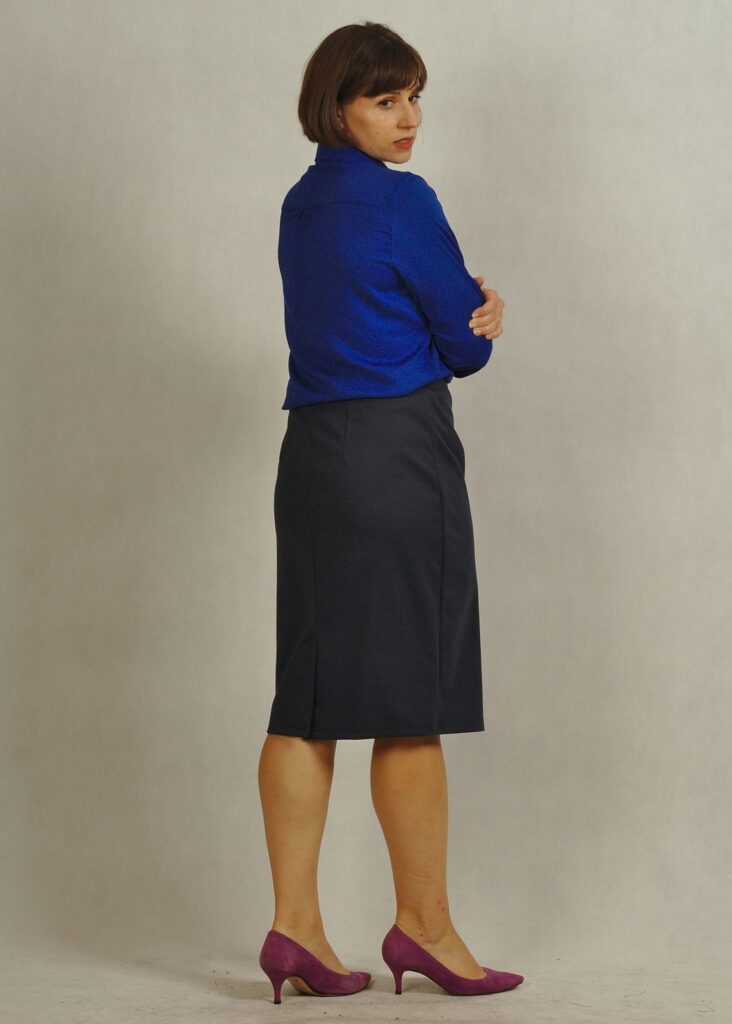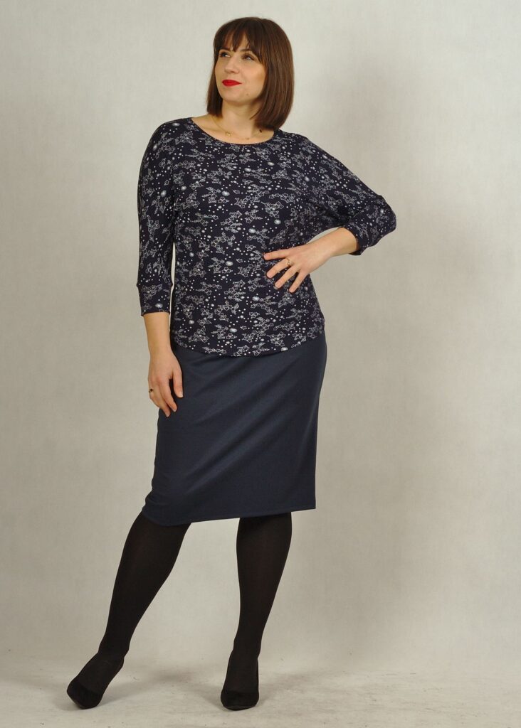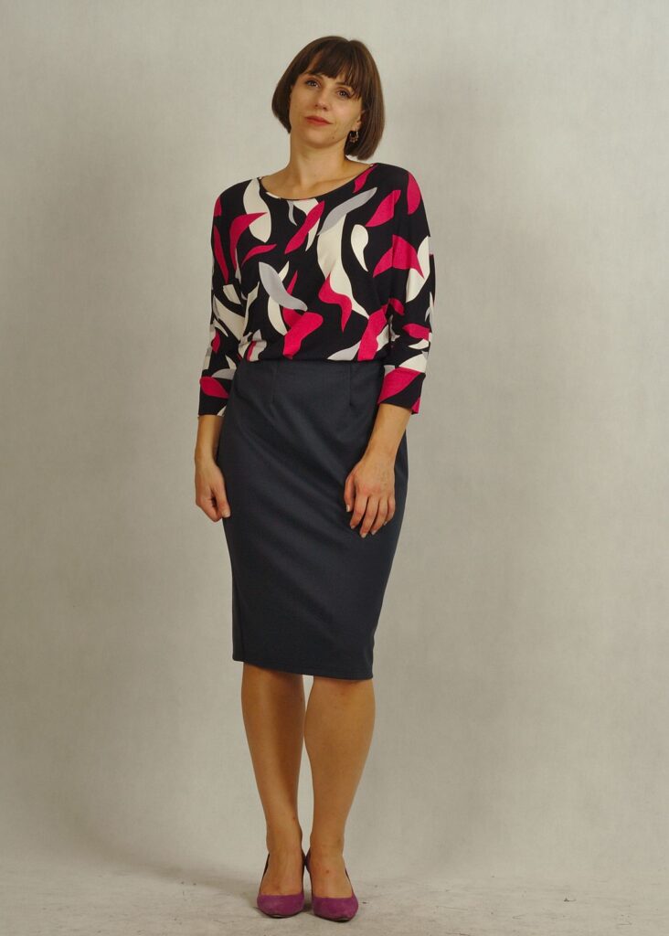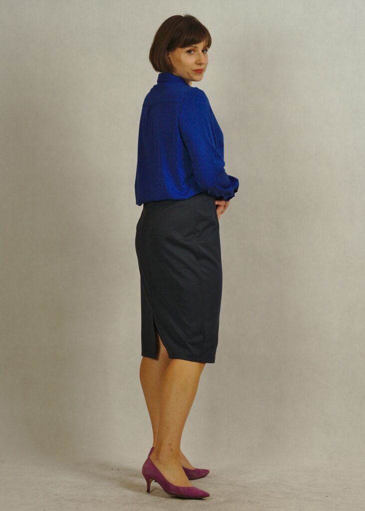 Spódnica ma długość delikatnie za kolano.