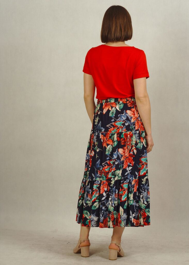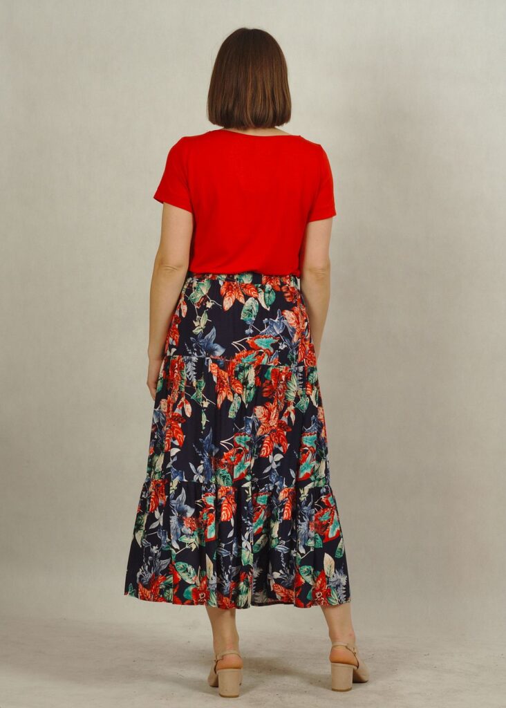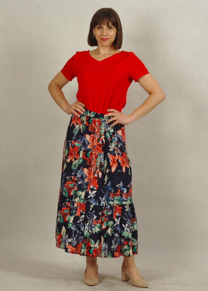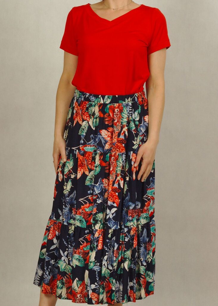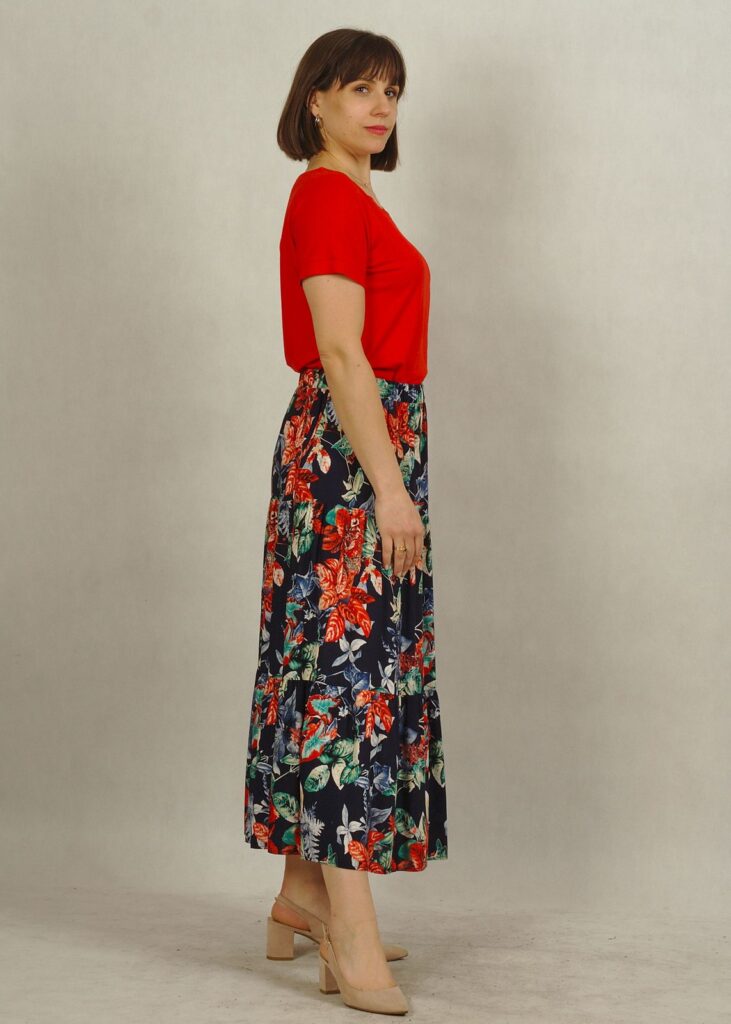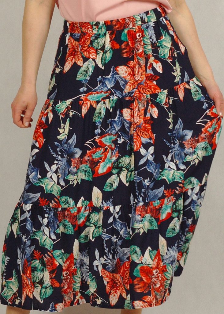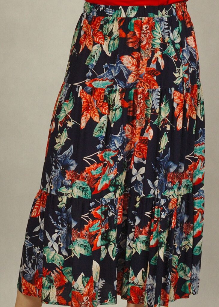 Kolor bazowy spódnicy to granat. Na nim kwiaty w odcieniach czerwieni i liście w odcieniach zieleni i błękitu*.