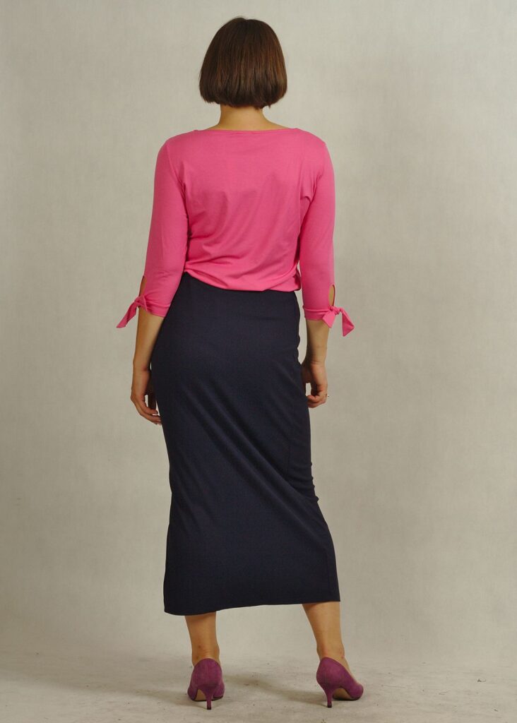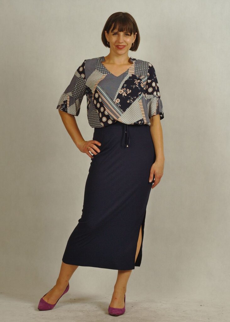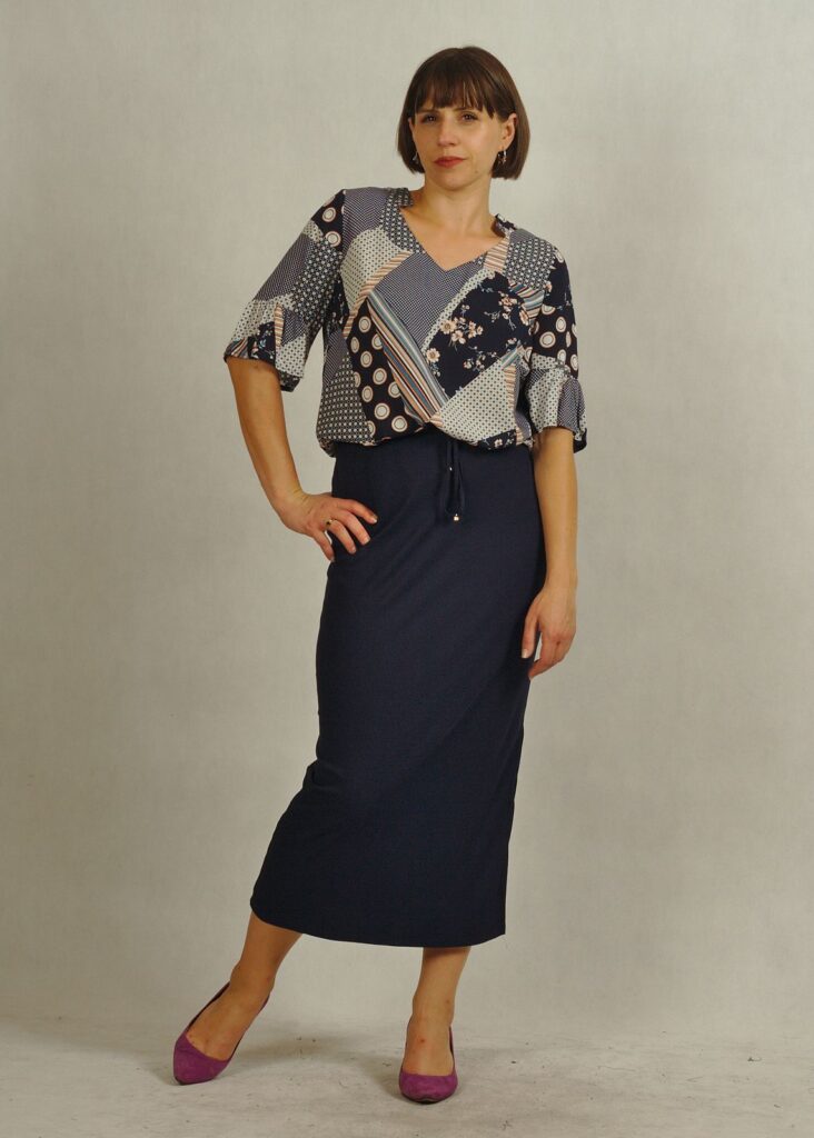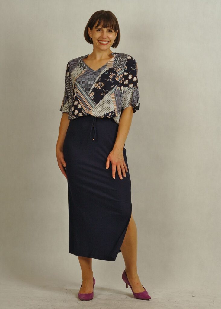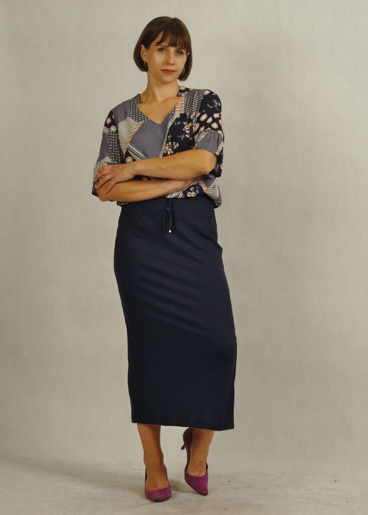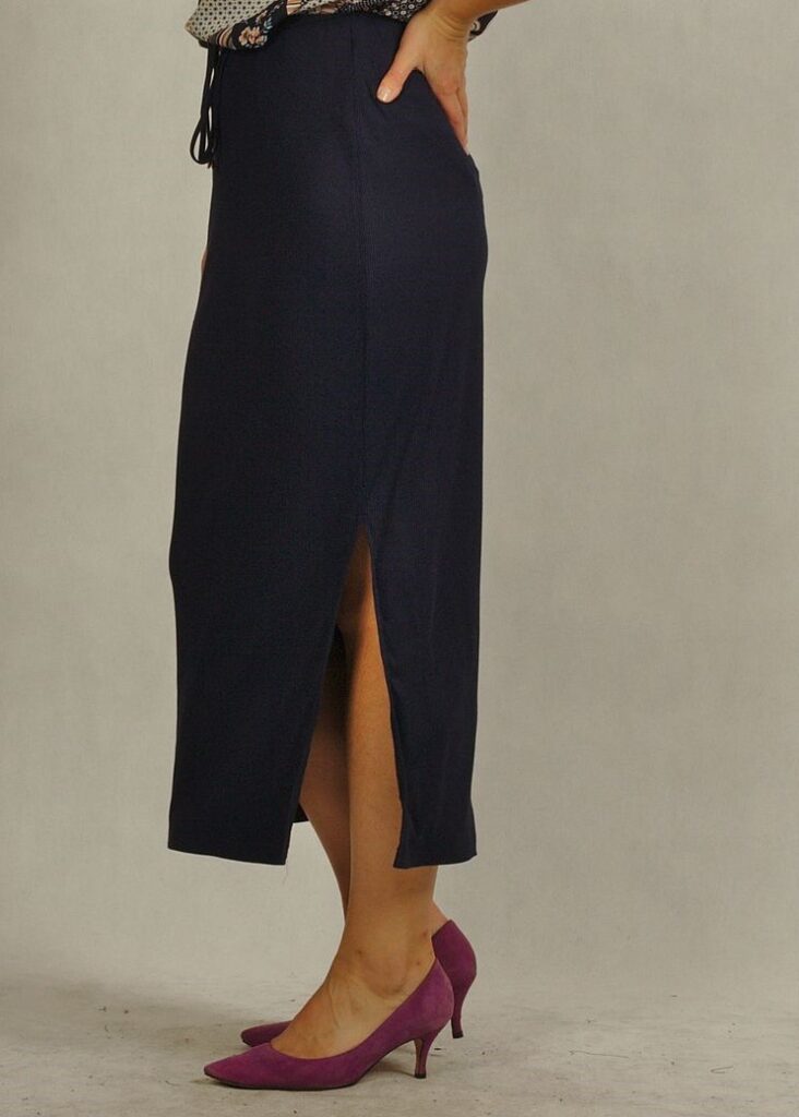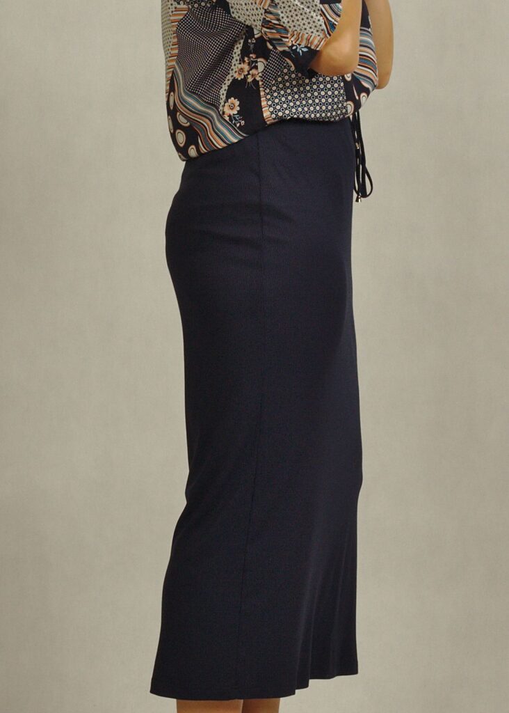 Modna i bardzo wygodna spódnica wykonana z dzianiny prążkowanej w kolorze granatowym.