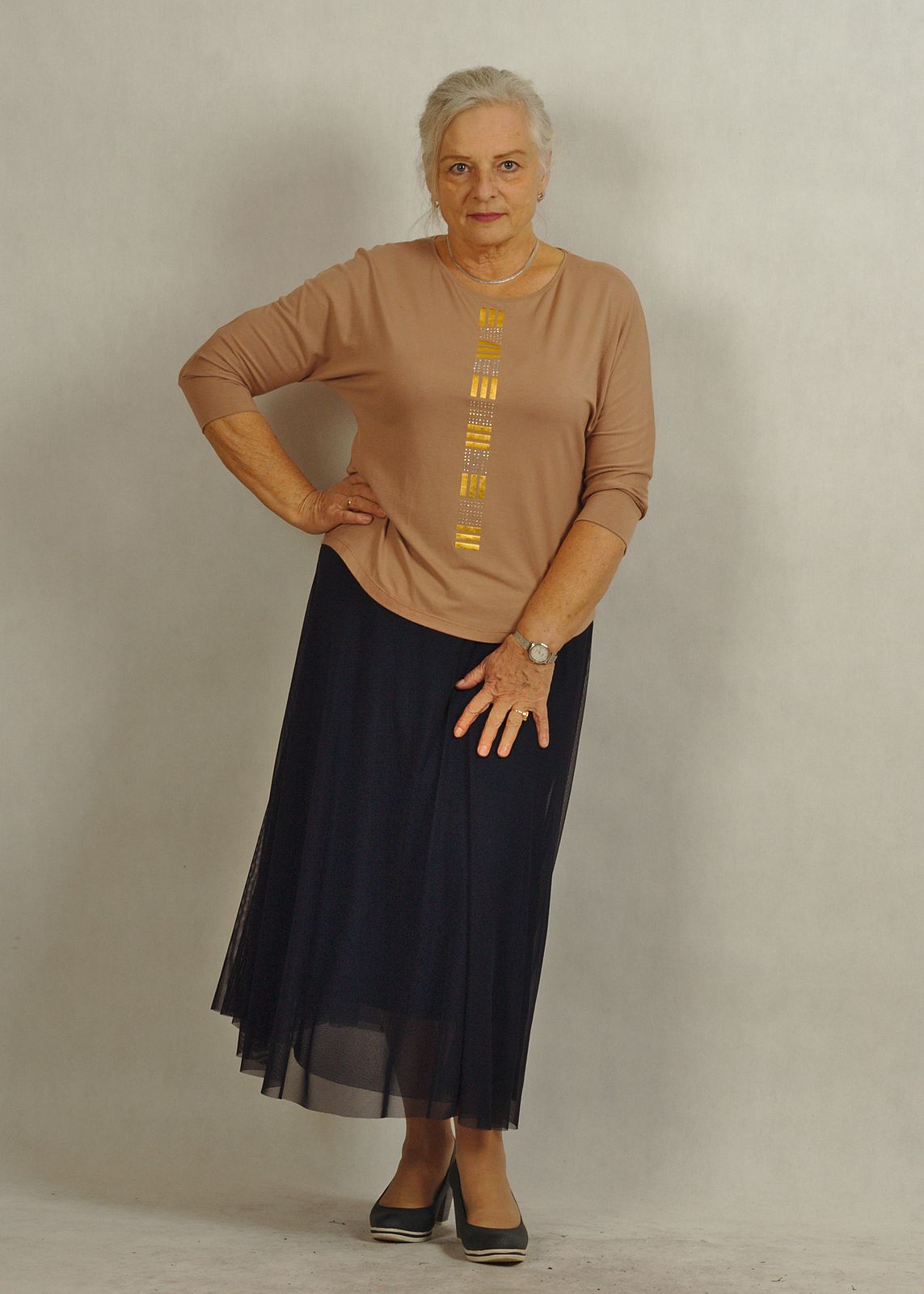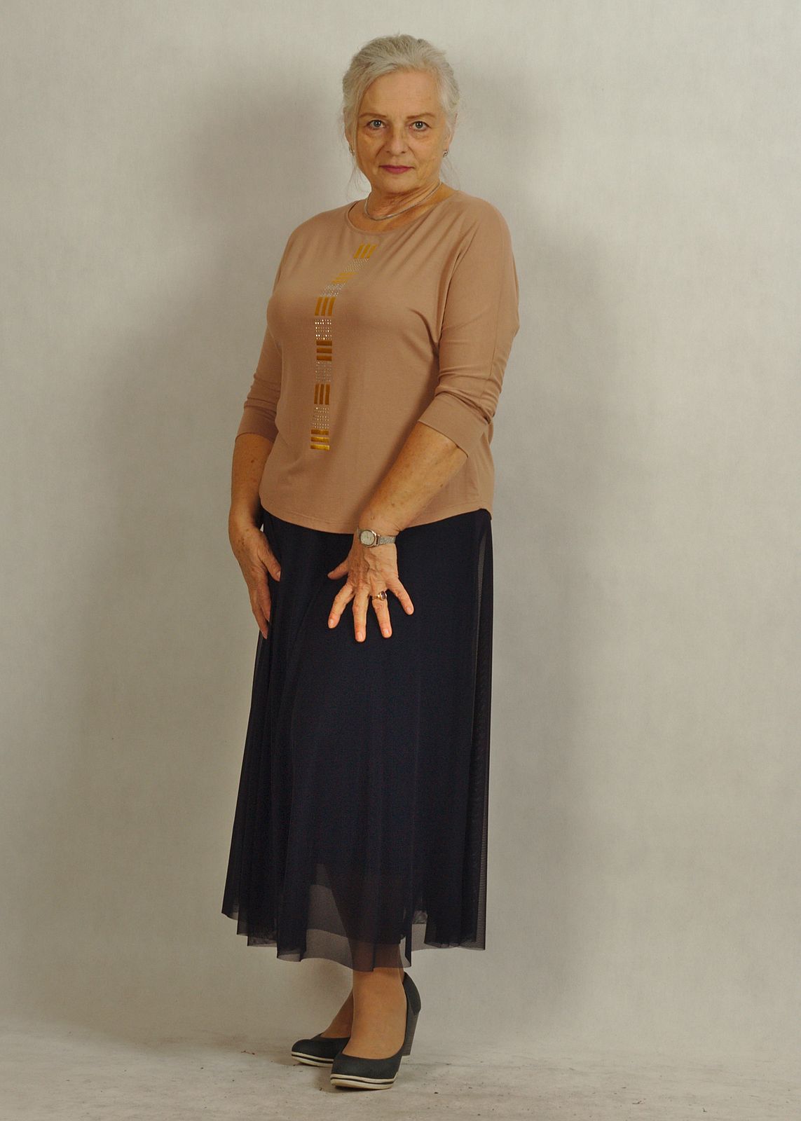 Długa spódnica składająca się z dwóch części – z wiskozowej podszewki z dzianiny oraz z poliestrowej siatki drukowanej.
