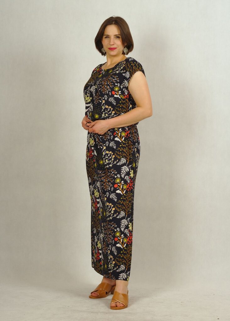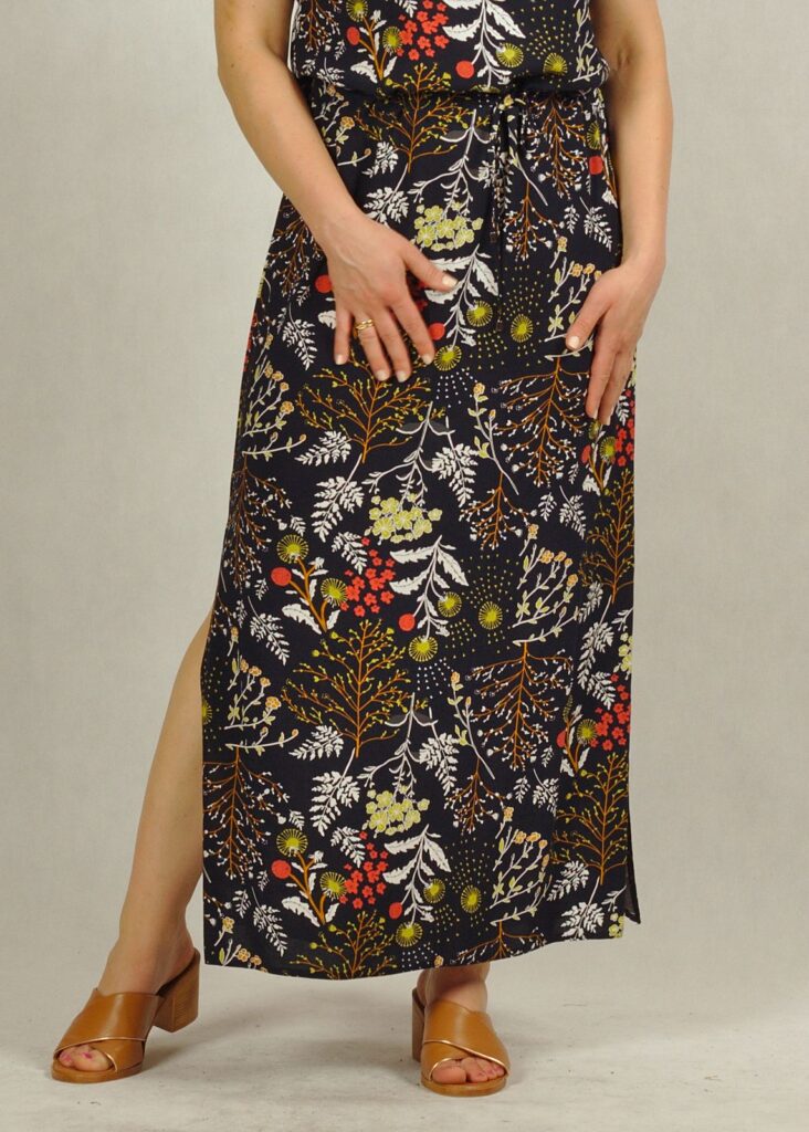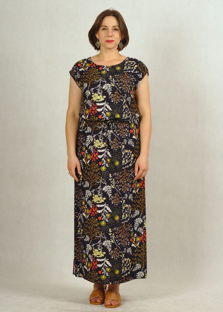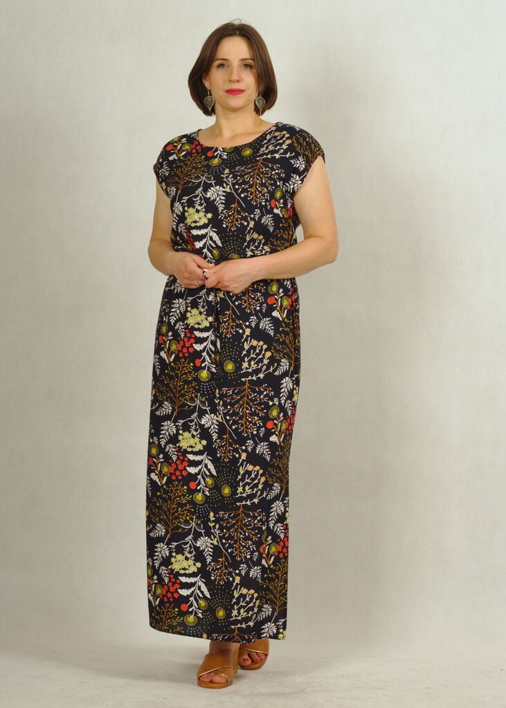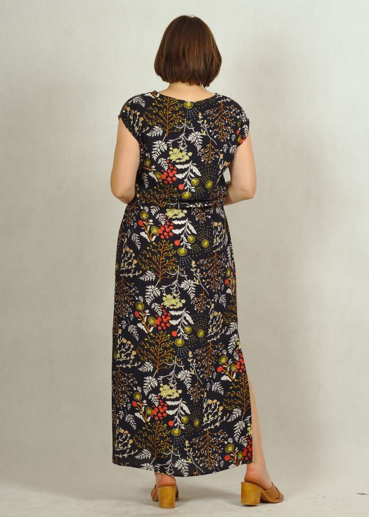 Sukienka ma długość maxi, a charakterystyczne rozporki z boków nadają jej lekkości i potęgują wygodę jej noszenia.