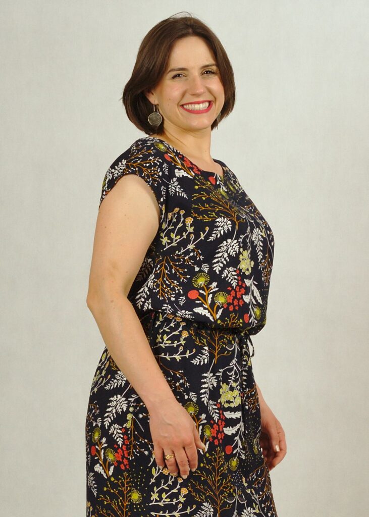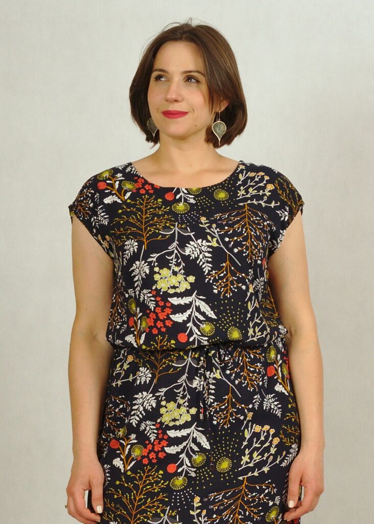 Sukienka posiada wszyty w tunel sznurek, który pozwala dostosować szerokość w talii.