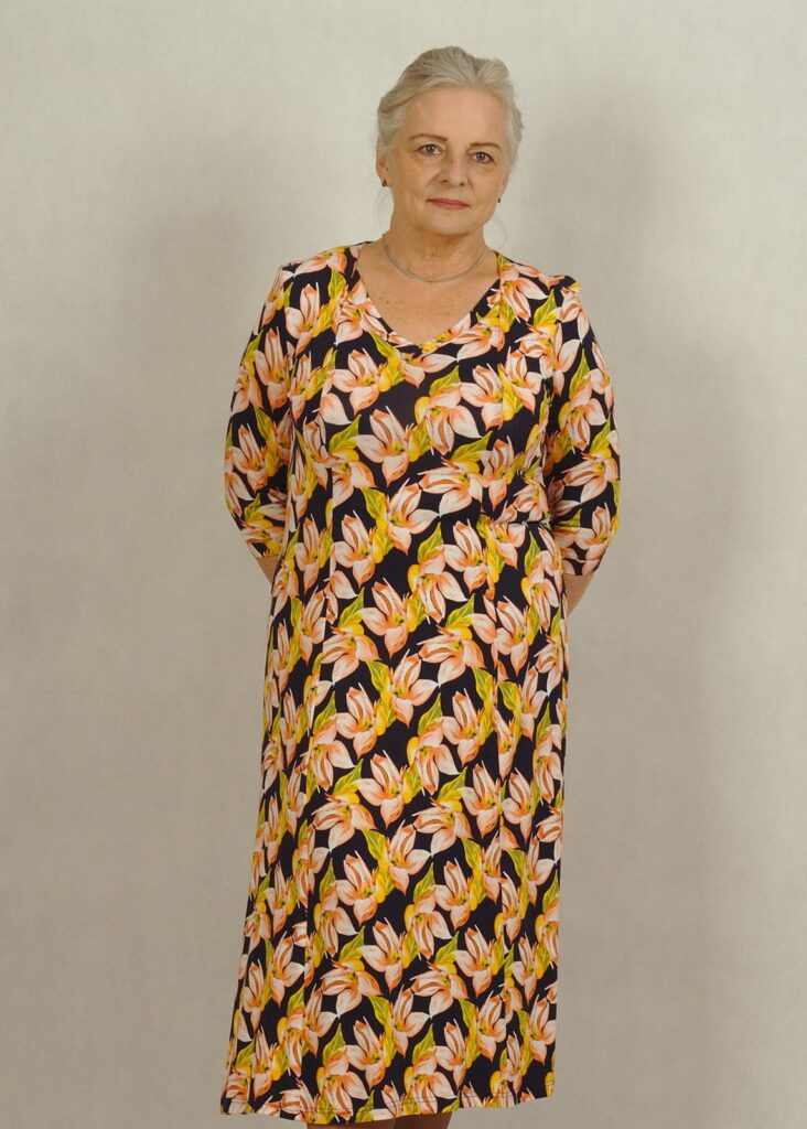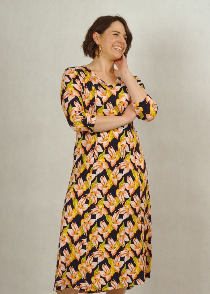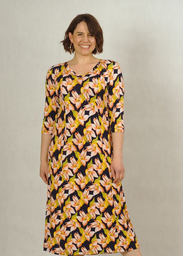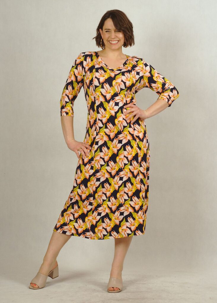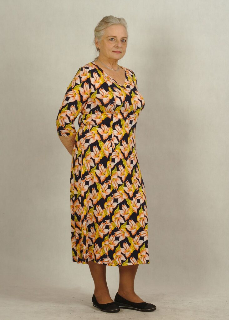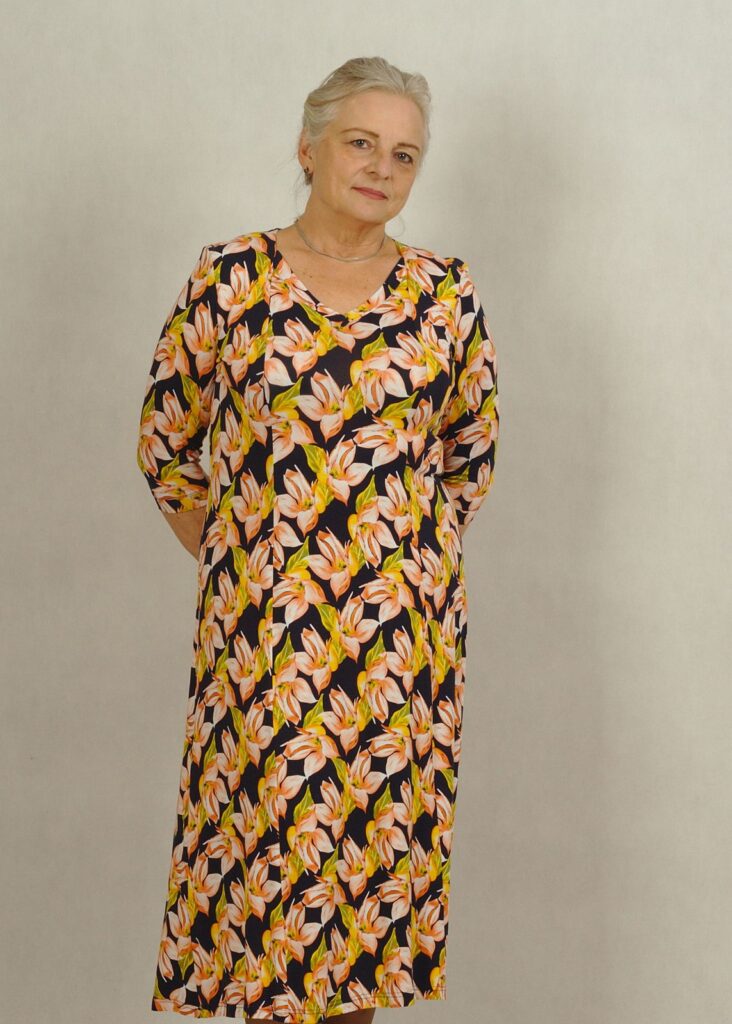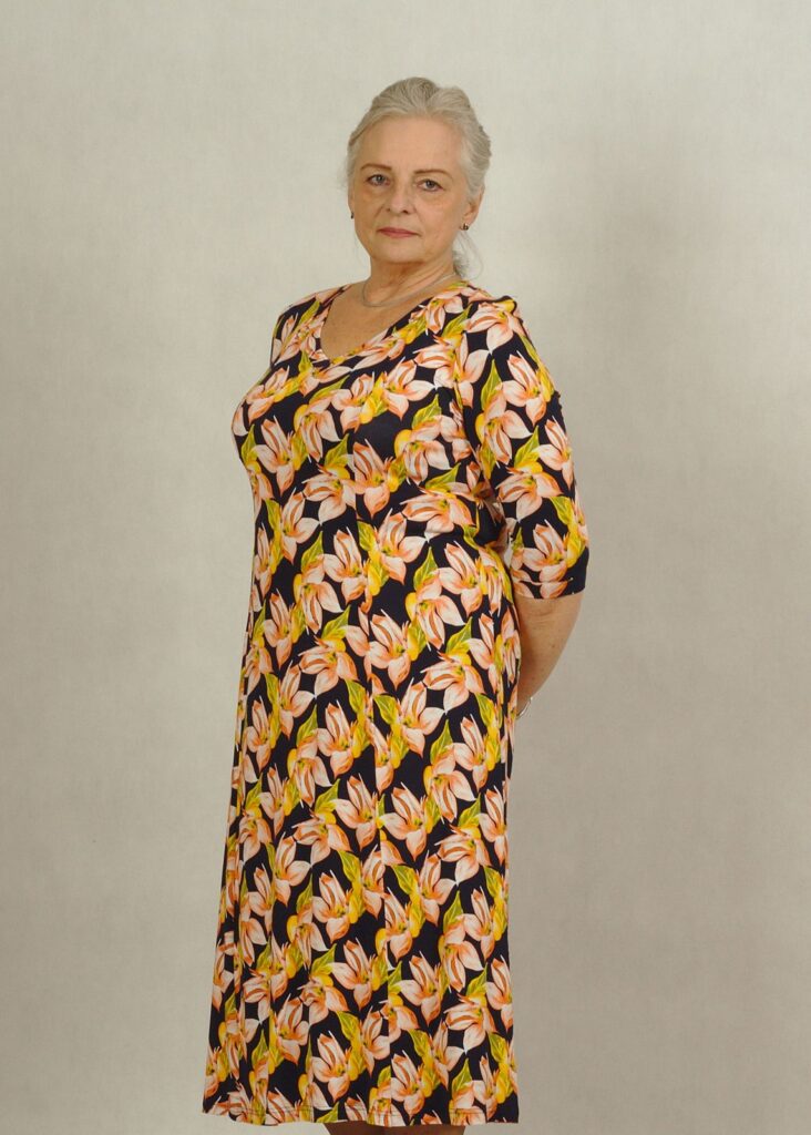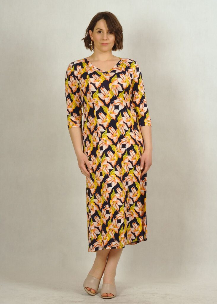 Sukienka urzeka swoimi kolorami – kontrastowe duże kwiaty w delikatnym pomarańczowym odcieniu, na granatowym tle.*