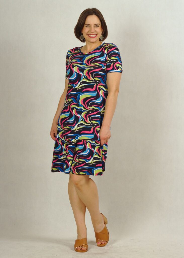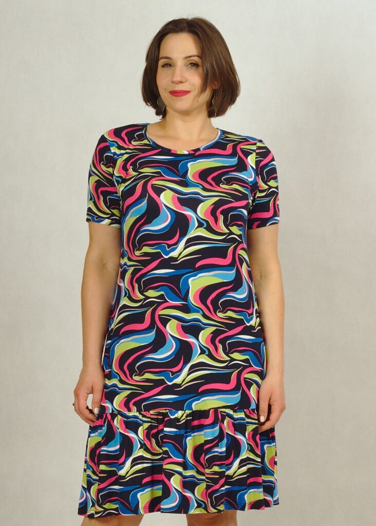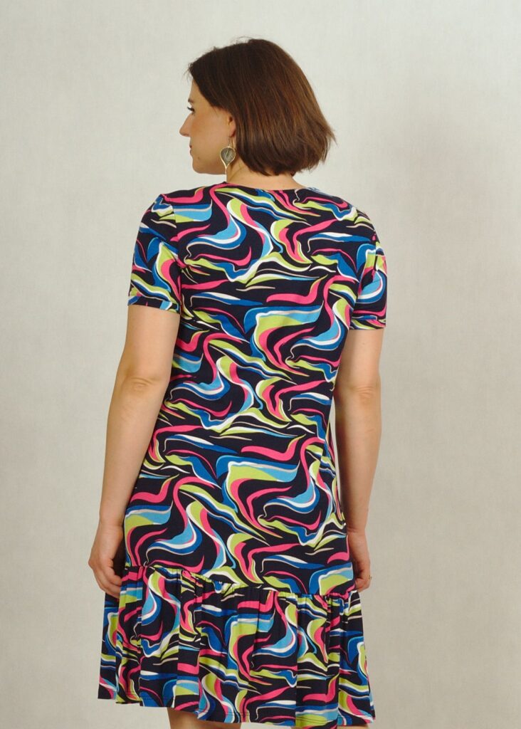 Uszyta z dzianiny wiskozowej, zakończona u dołu bardzo subtelną falbanką, która dodaje sukience uroku.