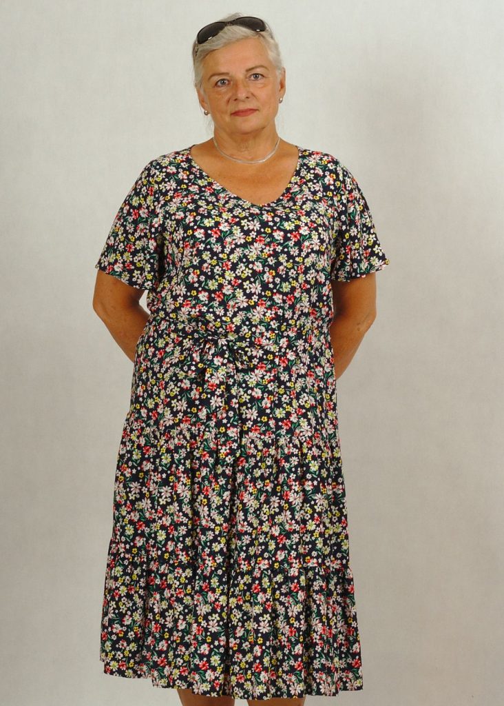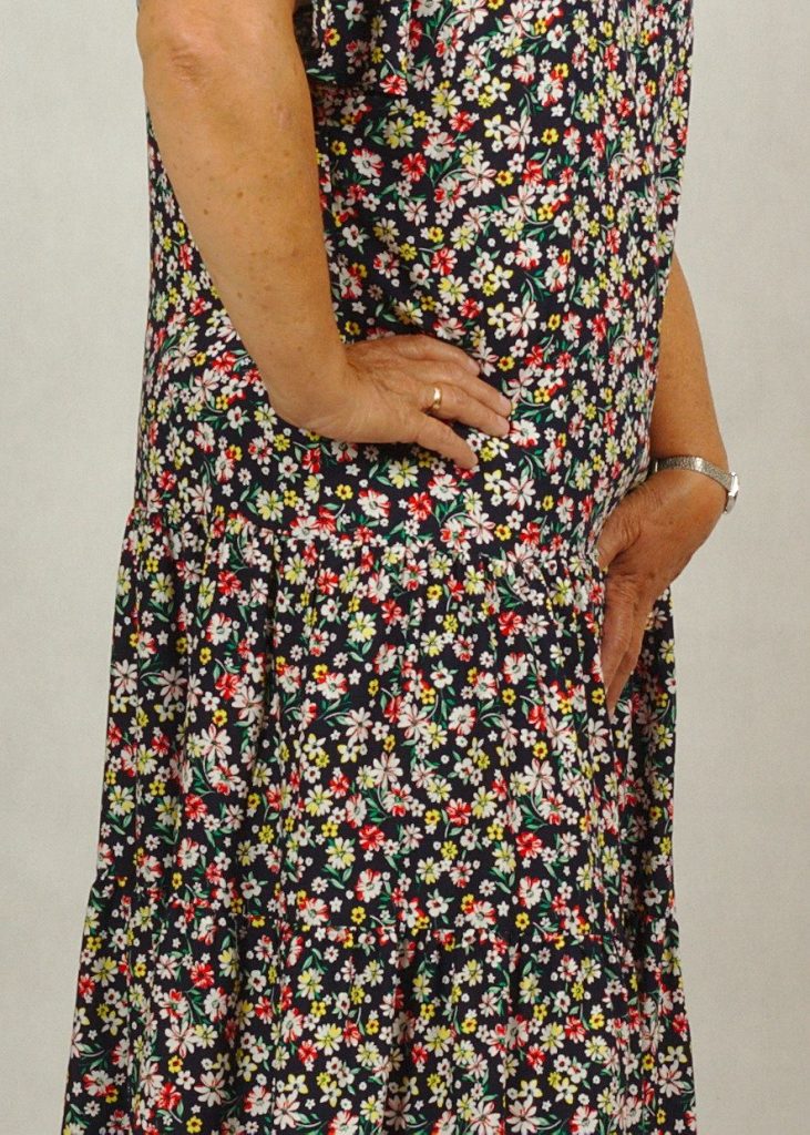 Kolor bazowy sukienki to granatowy, a kwiatuszki mają kolor: biały, czerowony i żółty.*
