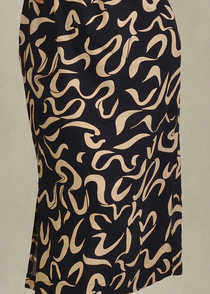 Beżowo-granatowy wzór przyciąga uwagę, a subtelne rozcięcia na rękawkach dodają lekkości.