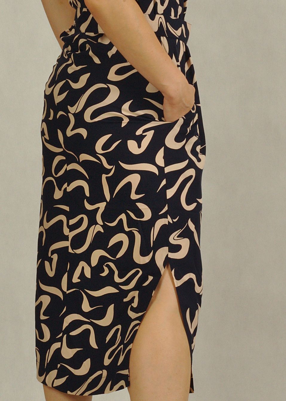 Odzież damska z charakterem – sukienka granatowa i beżowa w nowoczesnym wydaniu. Stylowe ubrania damskie szyte z pasją i troską o kobiecą sylwetkę