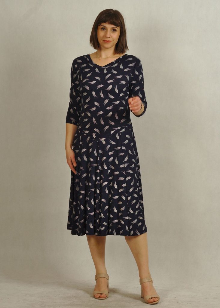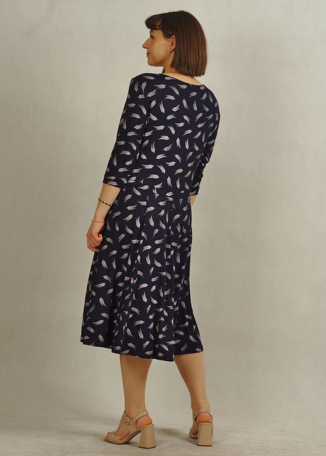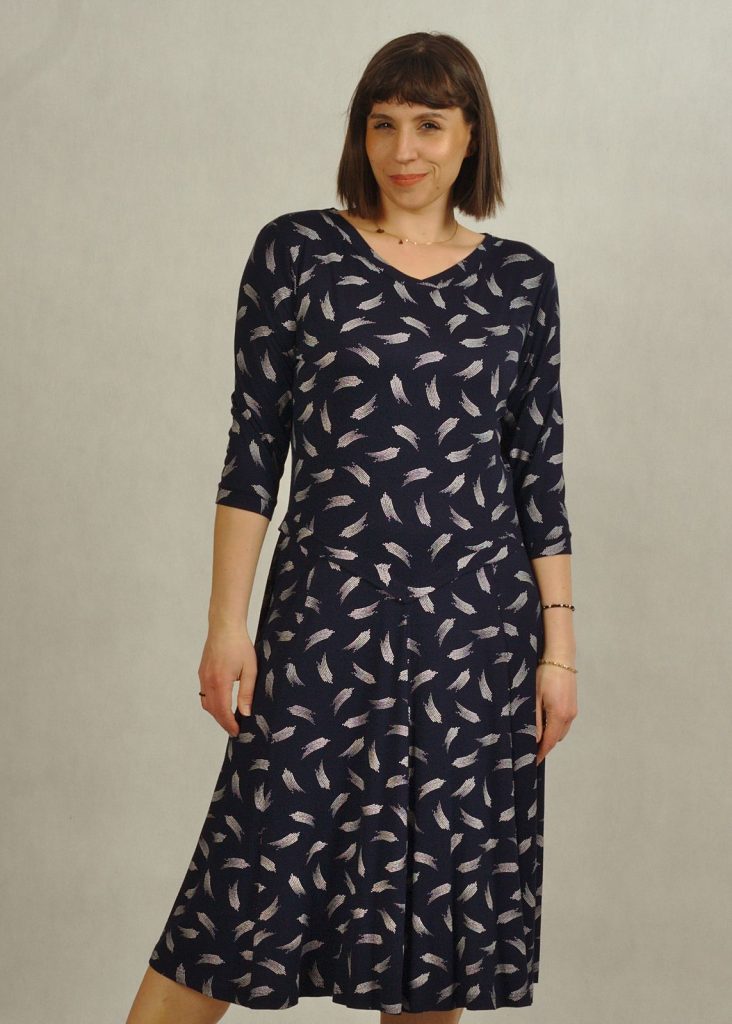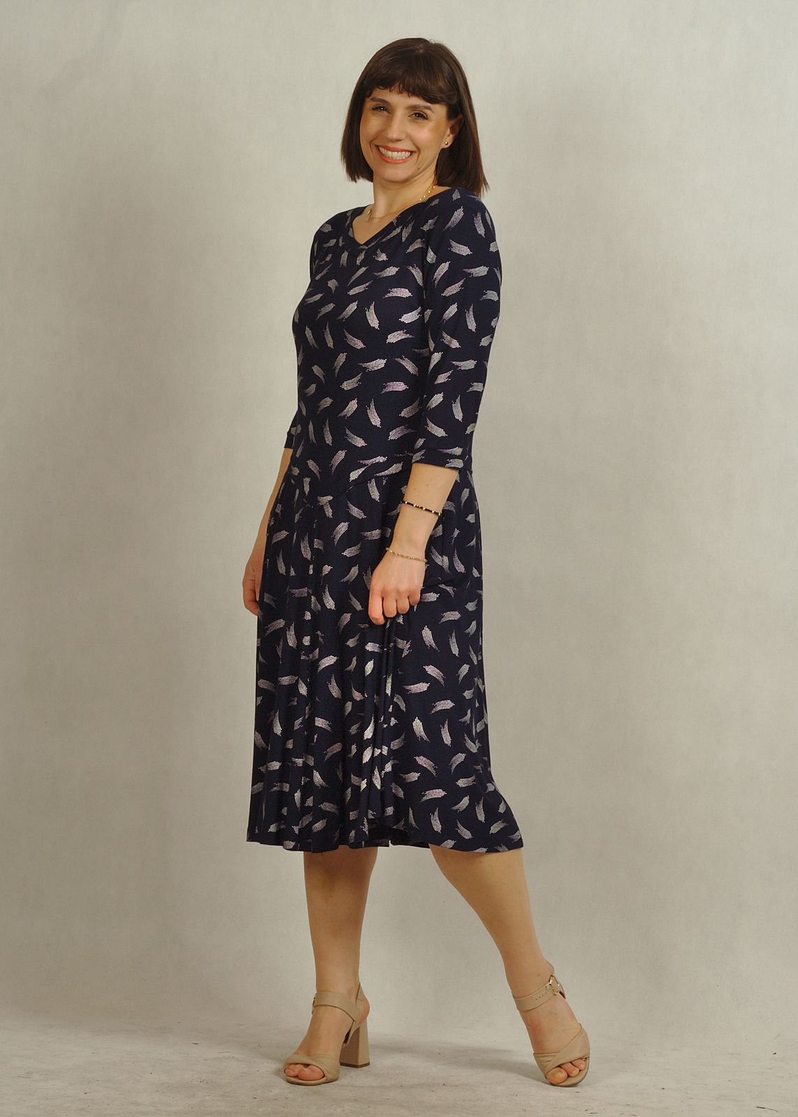 Praktyczny fason, jakim jest sukienka z rękawem 3/4, sprawia, że model nadaje się zarówno do pracy, jak i na spotkania.