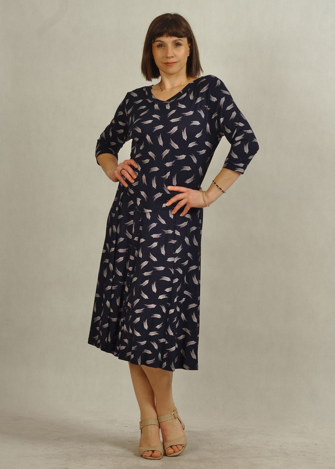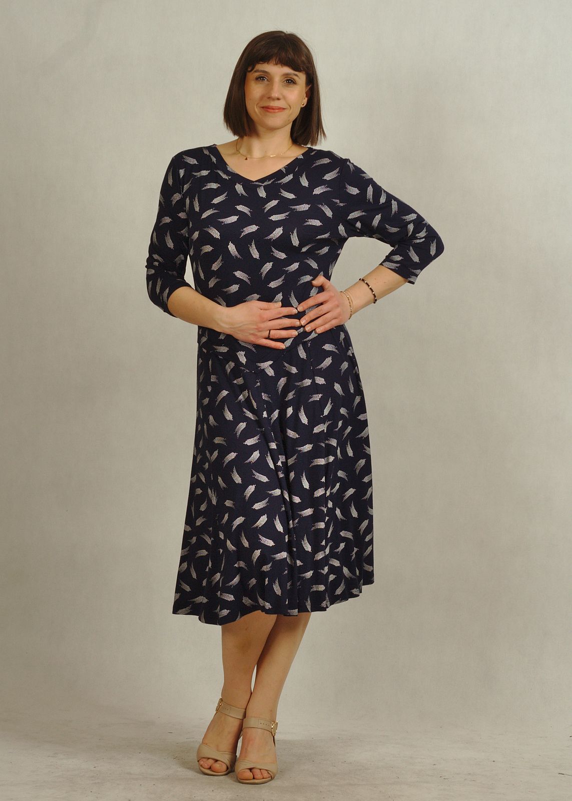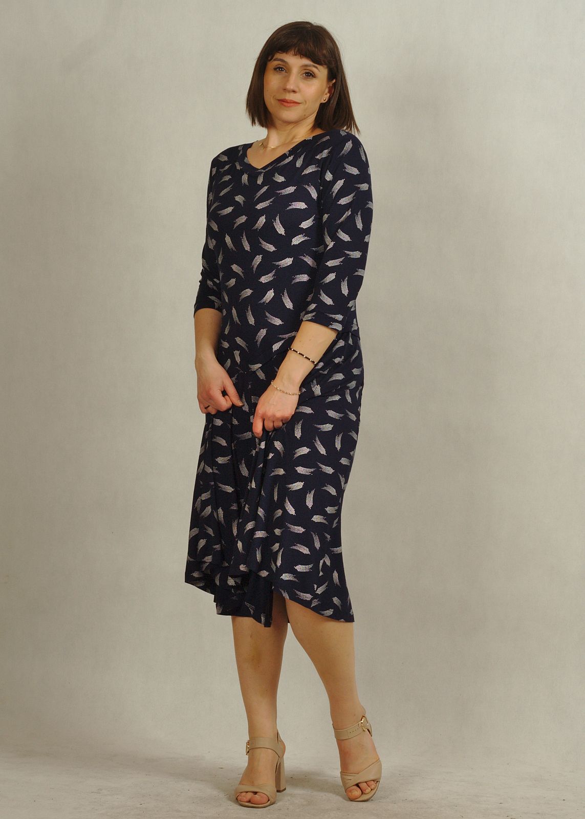 Praktyczny fason, jakim jest sukienka z rękawem 3/4, sprawia, że model nadaje się zarówno do pracy, jak i na spotkania.