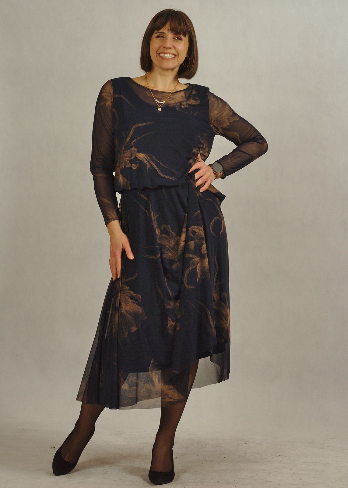 Olśniewająca sukienka granatowa to ponadczasowa klasyka na różne okazje, w złote kwiaty. Cała zachwyca oryginalnym stylem i lekkością.