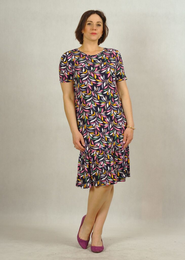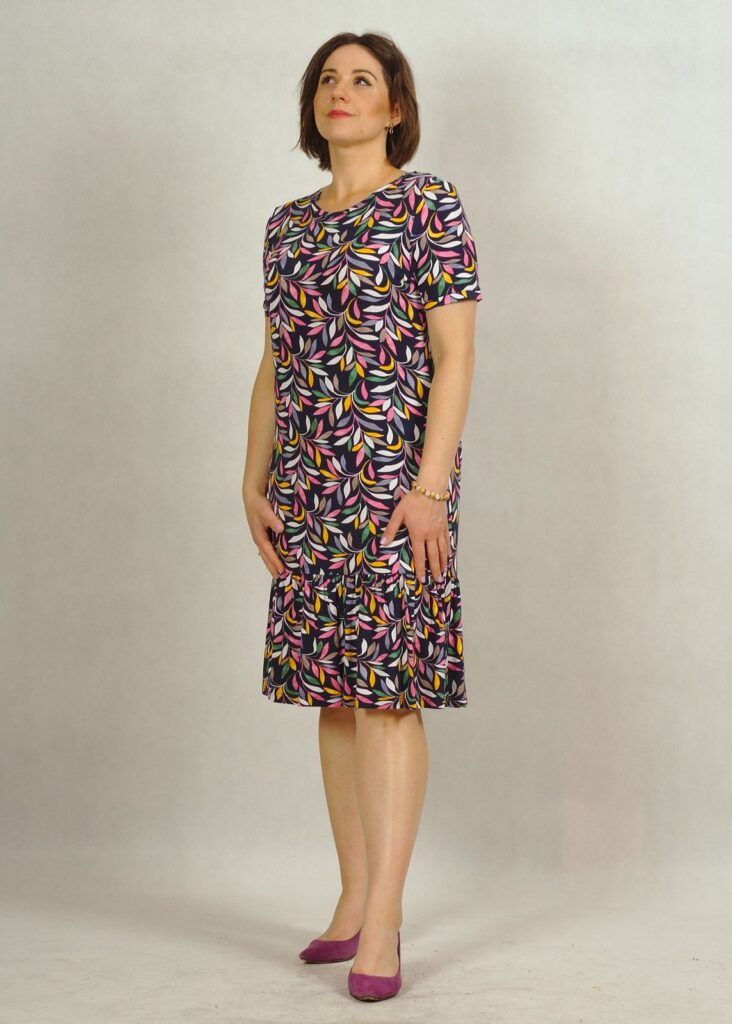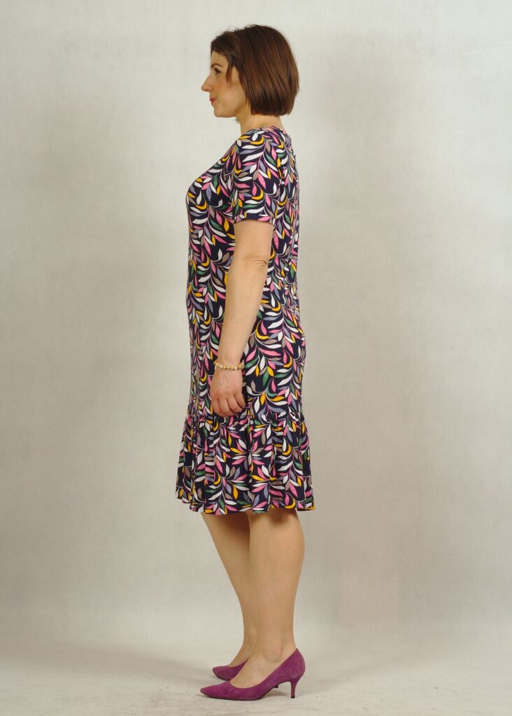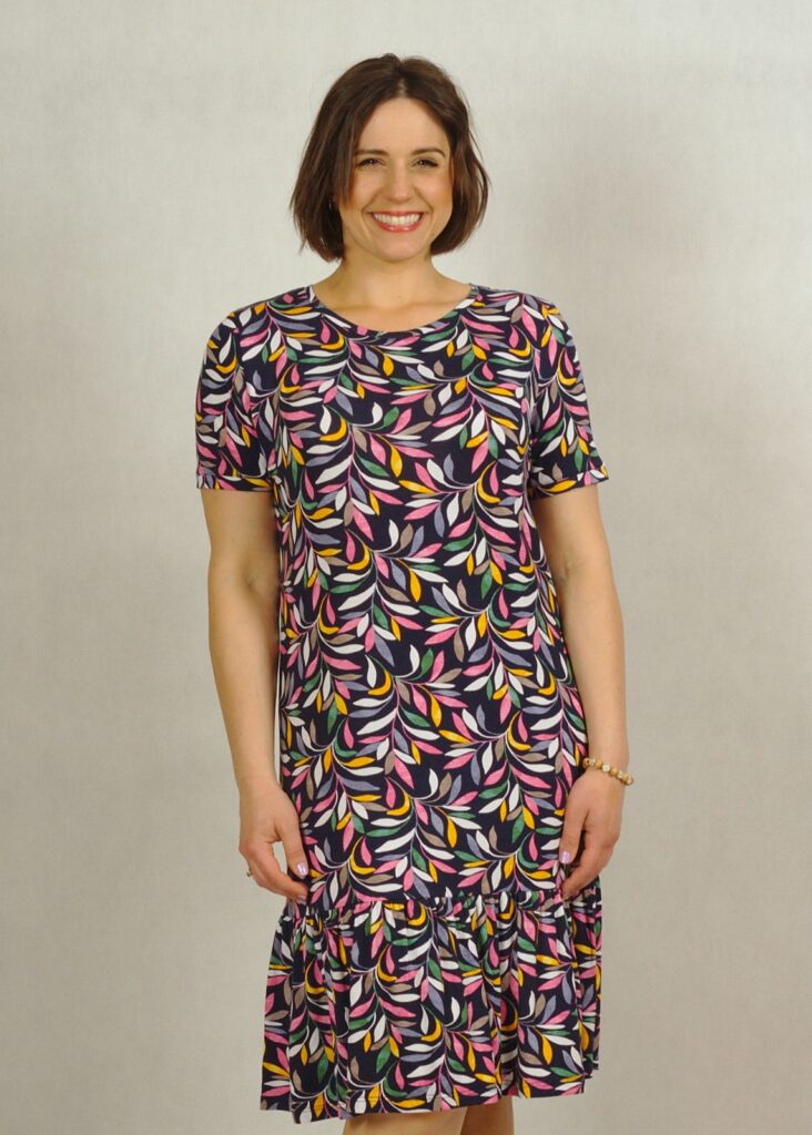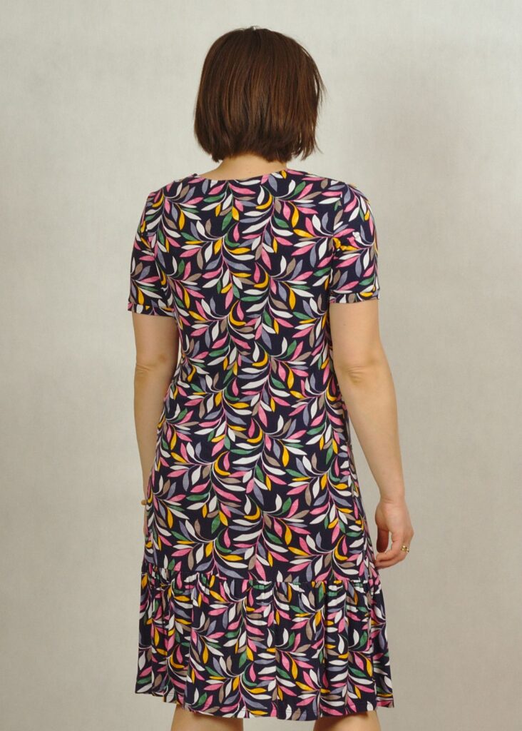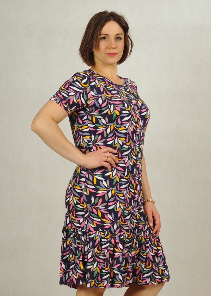 Sukienka ma kolor bazowy granatowy, a na niej kolorowe listki.*