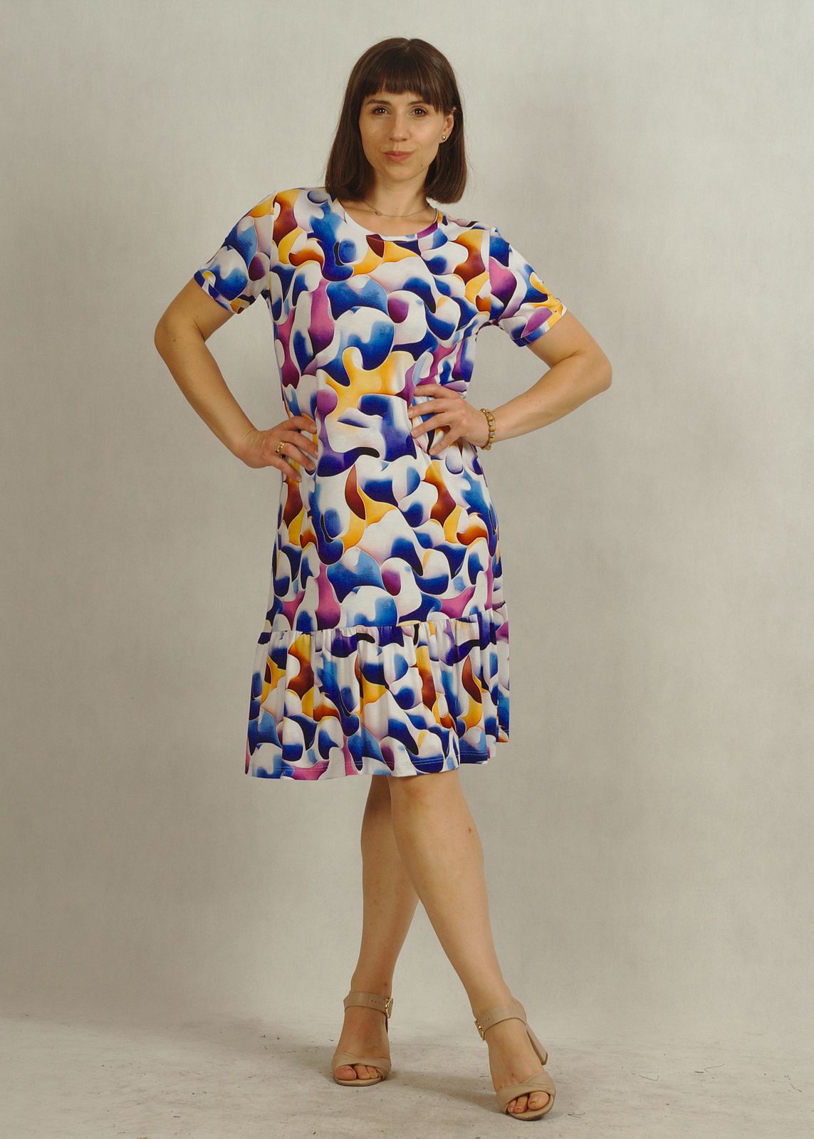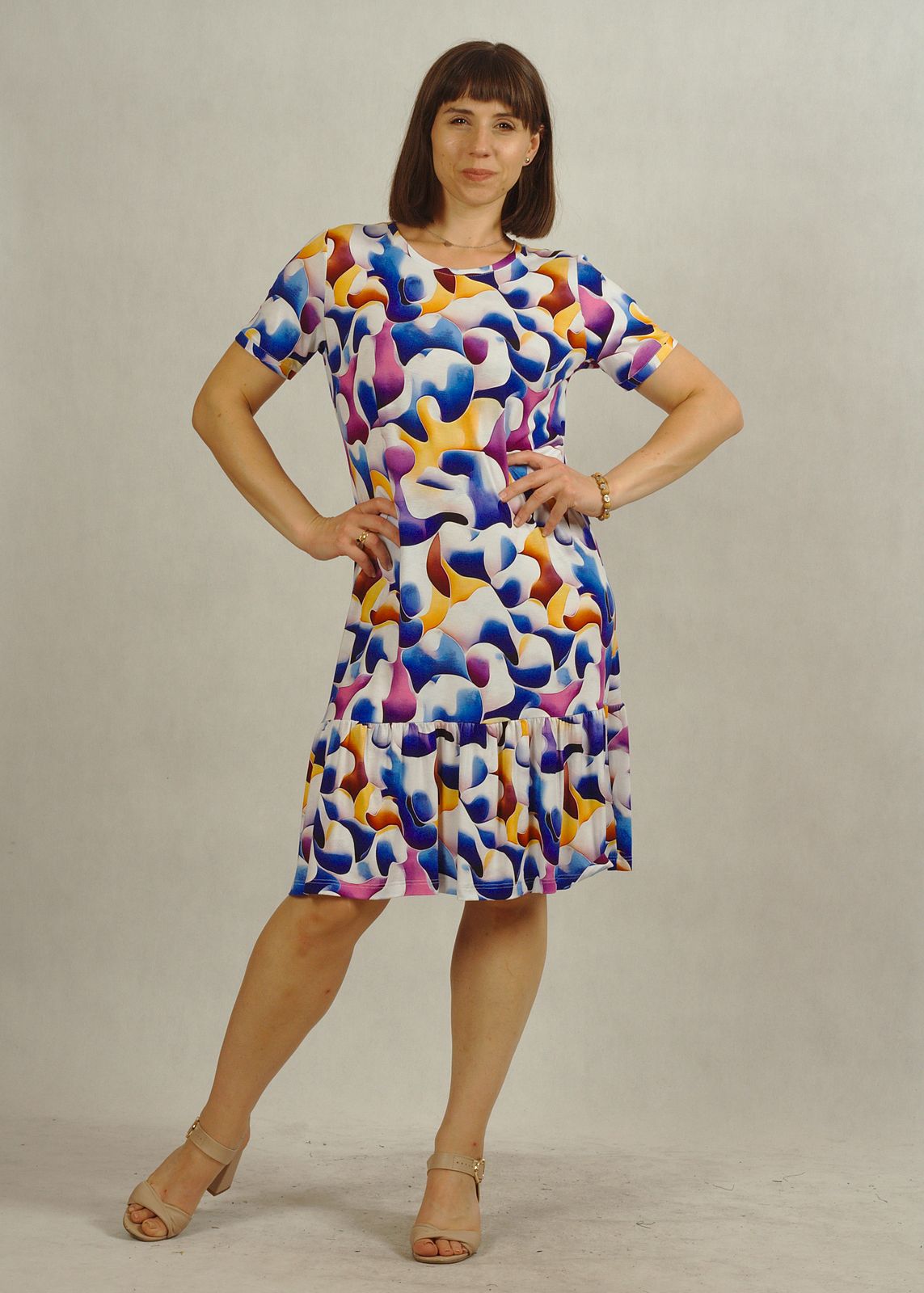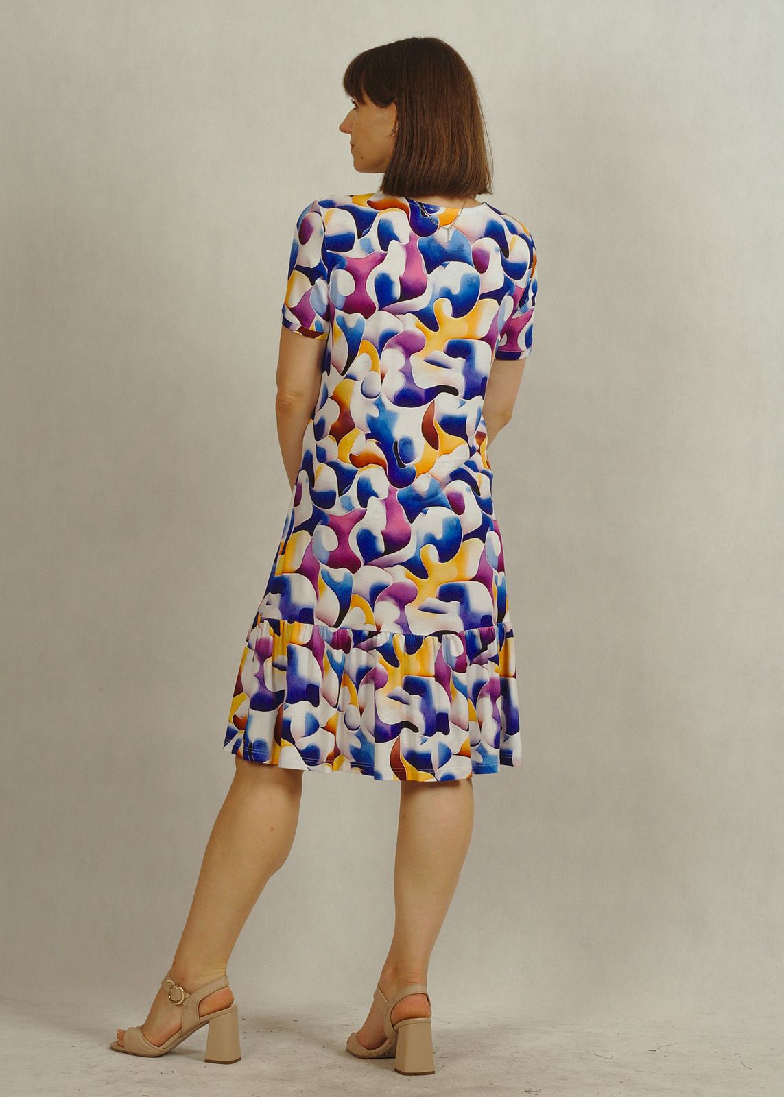Jasna sukienka dzianinowa w chabrowe wzory z falbanką /699/