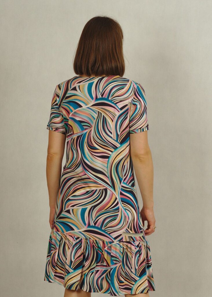 Wybierz tę jasną sukienkę w oryginalny wzór, która będzie uniwersalnym i wygodnym elementem Twojej letniej garderoby.