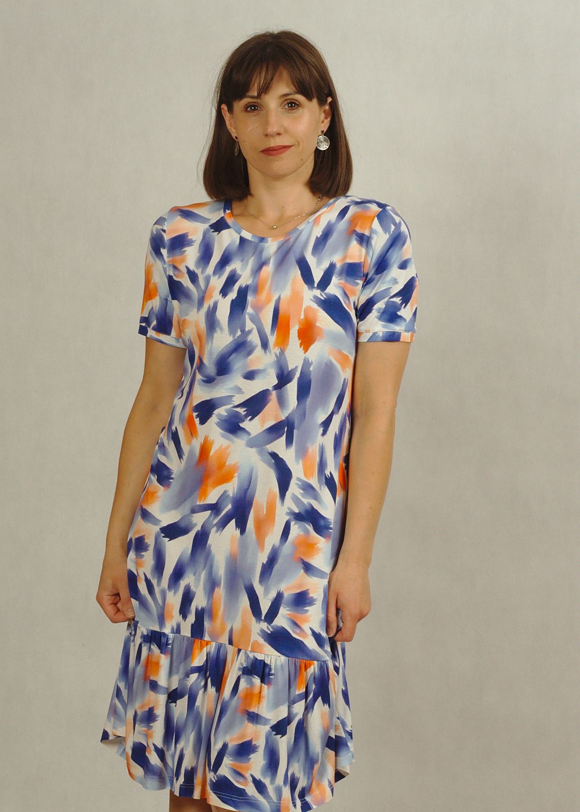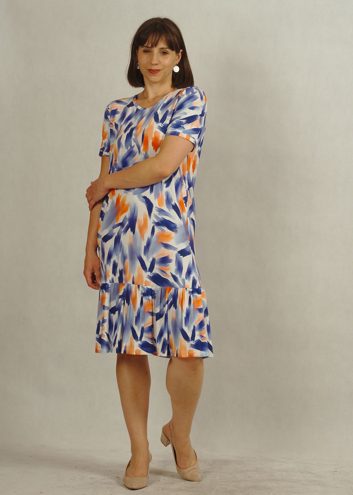 Sukienka o klasycznej długości, z krótkim rękawem i półokrągłym dekoltem, łączy wygodę z kobiecym stylem.