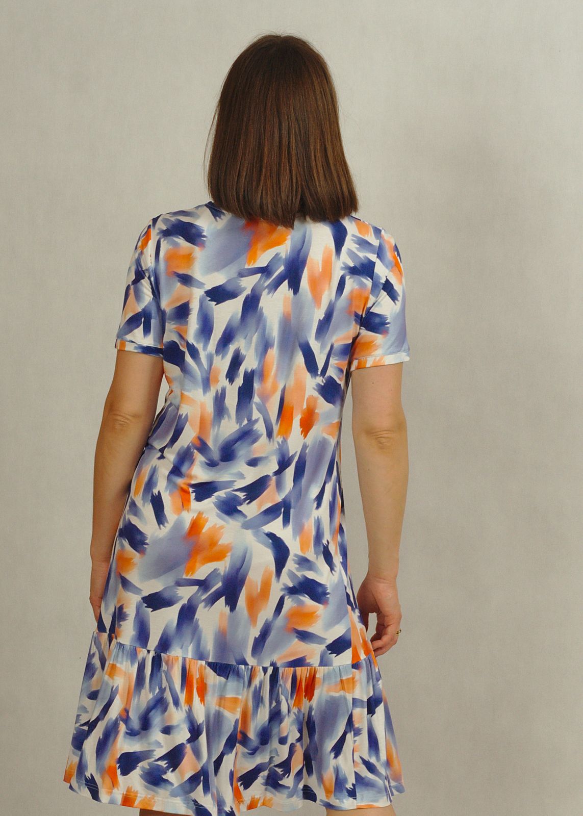 Długość całkowita sukienki dla rozmiaru M – 100cm; dla rozmiaru 4XL – 106cm. Długość falbanki – 25cm.