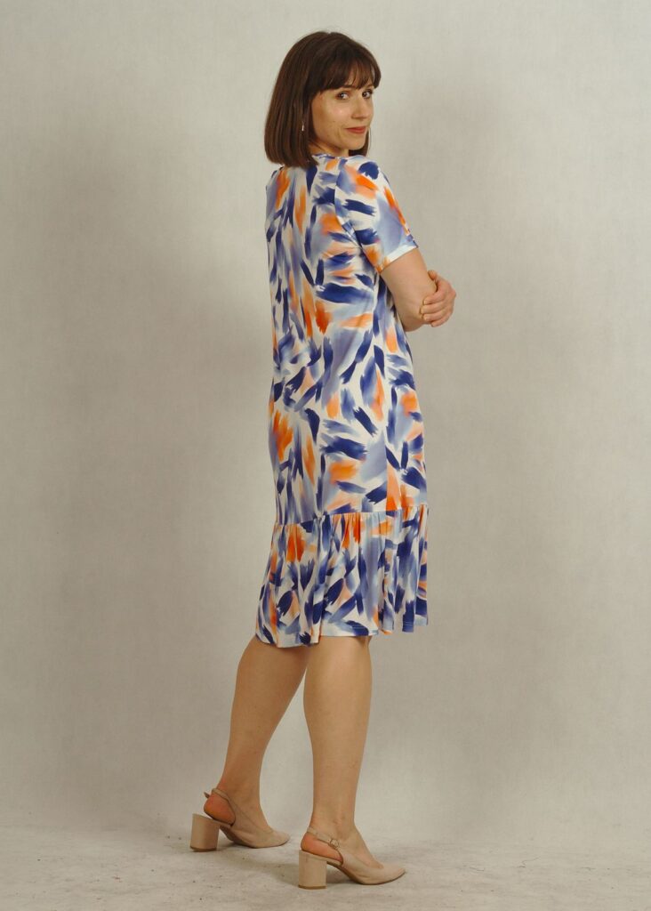 Delikatna falbanka nadaje sylwetce lekkości, a wzorzysta tkanina w niebieskie motywy przyciąga wzrok i wpisuje się w wakacyjne trendy.