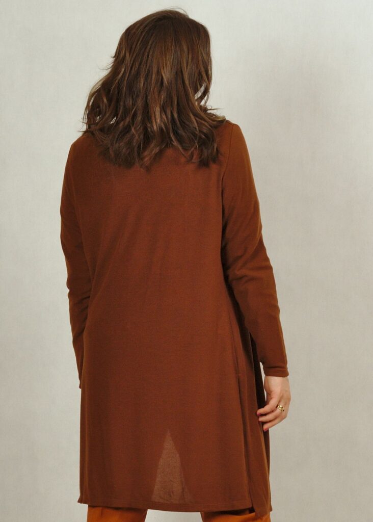 Kardigan ma długie rozporki i bardzo prosty klasyczny fason.