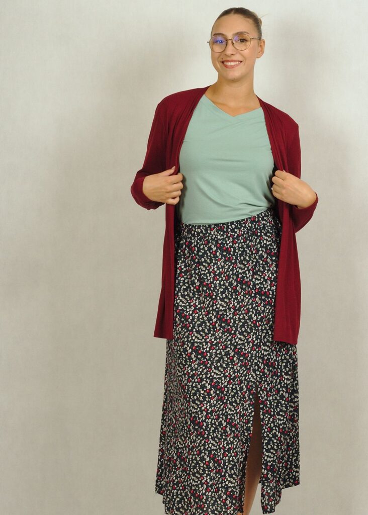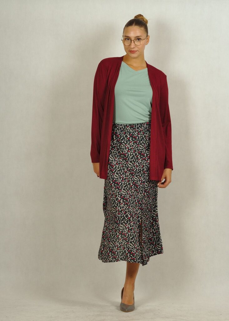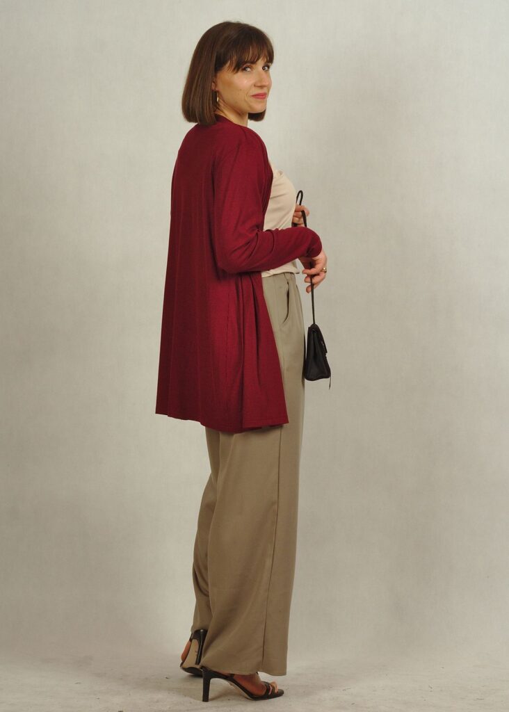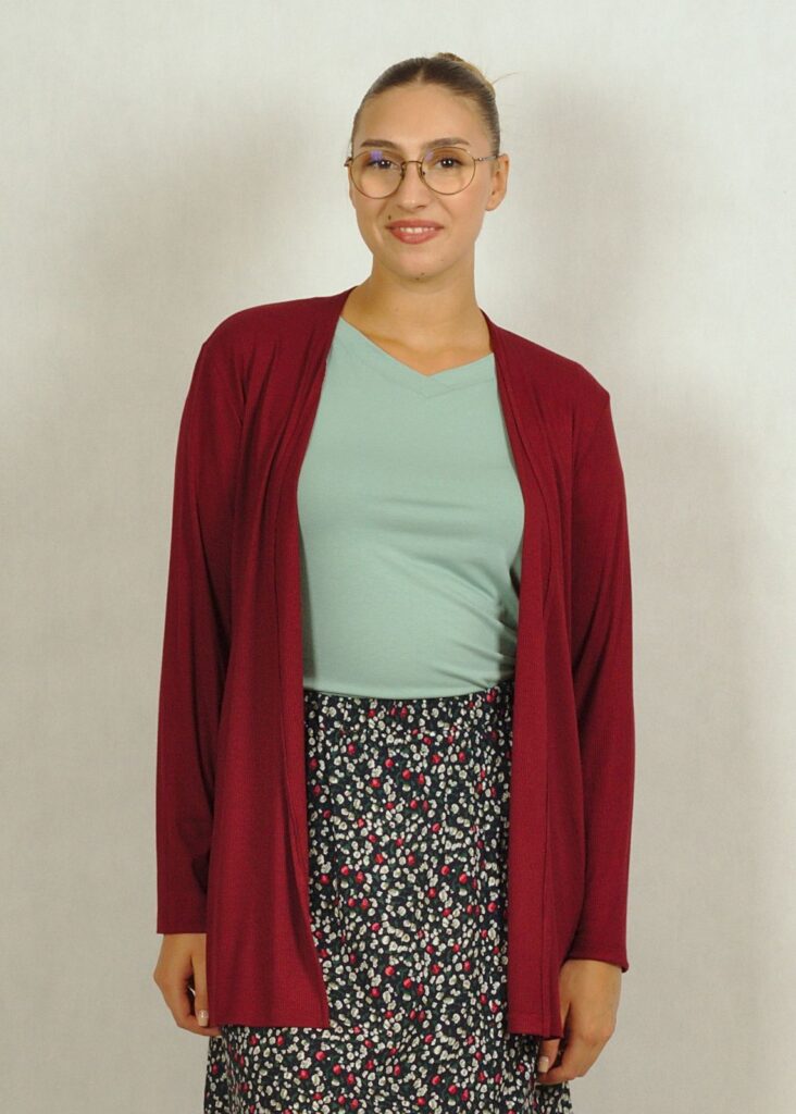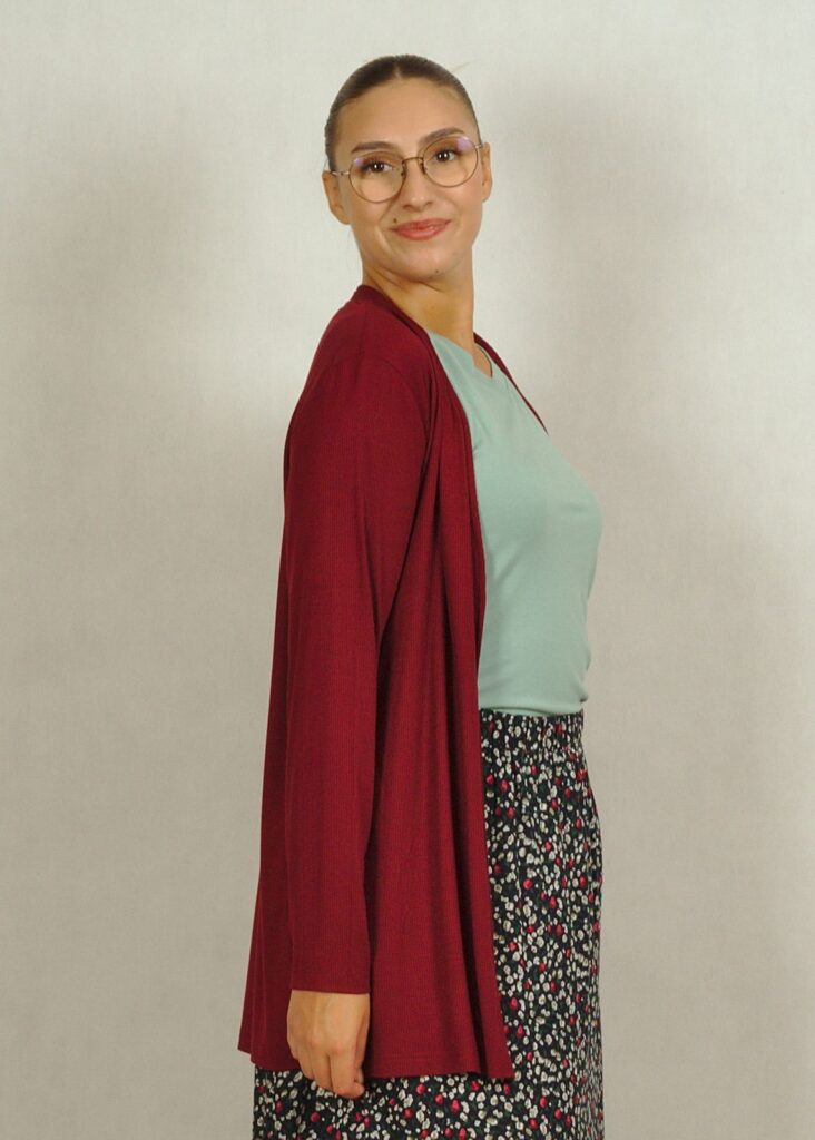 Bordowy* kardigan został uszyty z doskonałego materiału – wiskoza z elastanem!