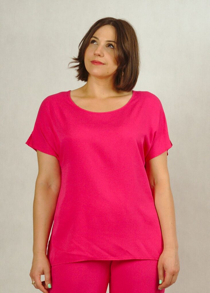 Bluzka to top o bardzo ciekawym fasonie, z lekką łezką z tyłu i z delikatnym krótkim rękawkiem.