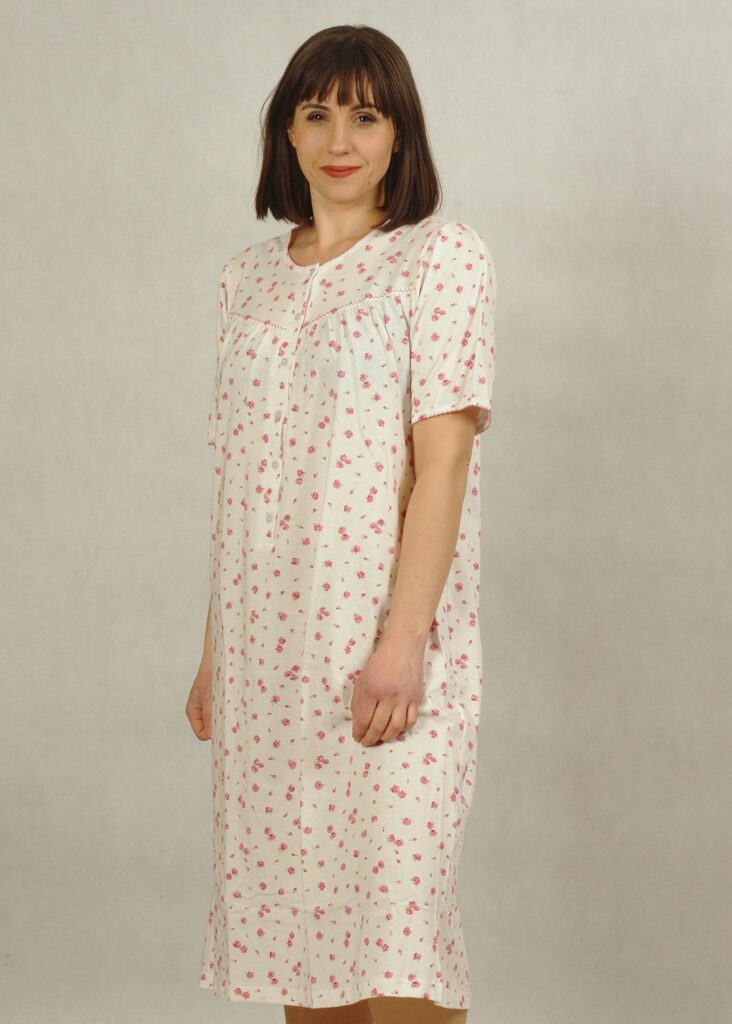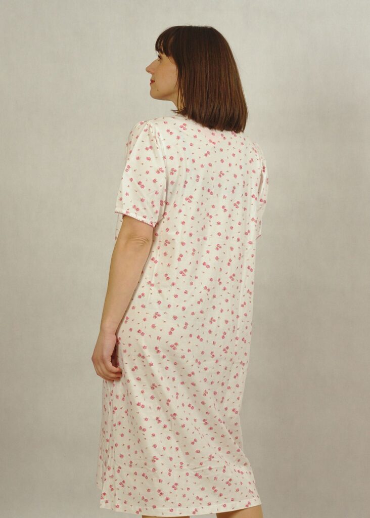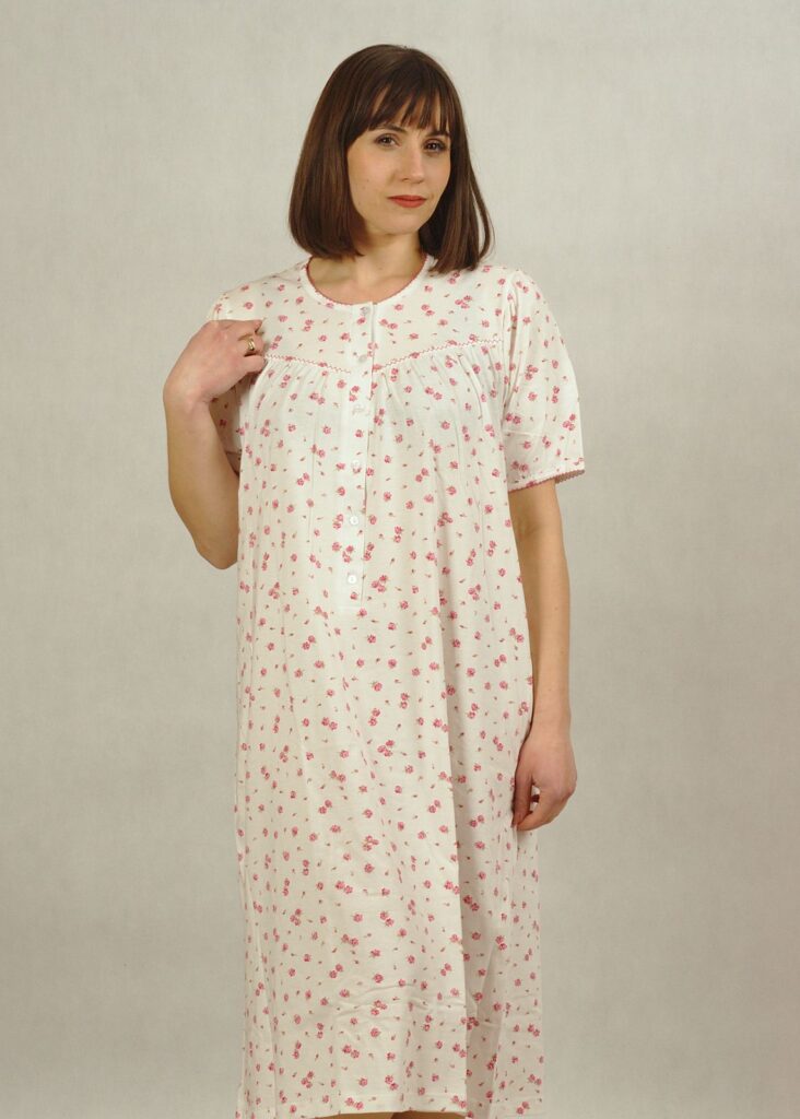 Łamana biel i drobne różowe różyczki, to idealne połączenie na koszulę nocną*.