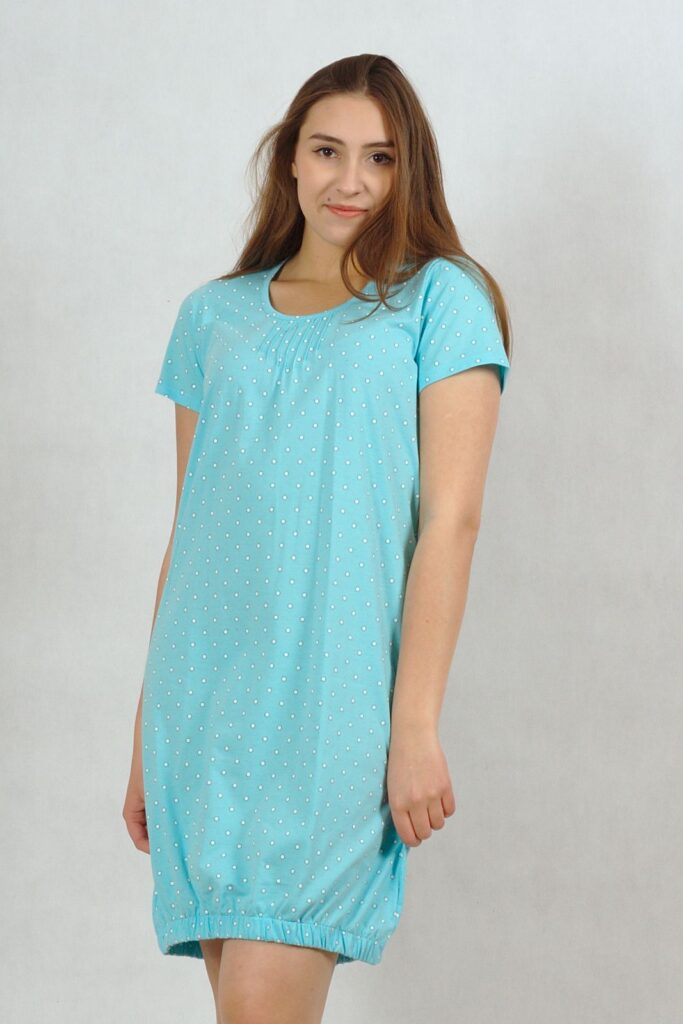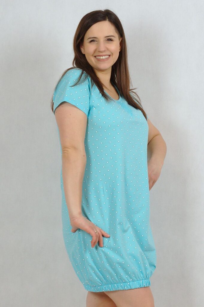Koszula nocna z krótkim rękawkiem. Z długością za kolano, z bardzo wygodnym ściągaczem.