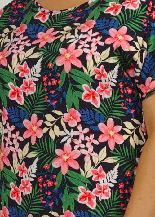 Kolor sukienki jest wielokolorowy, w duże kwiaty*.