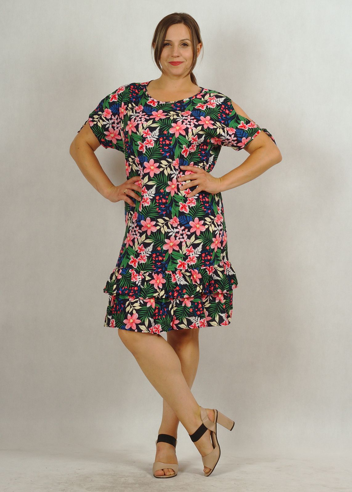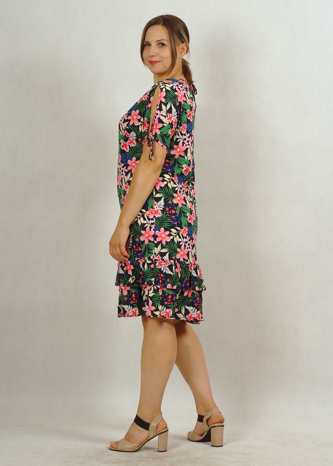 Kwiatowa sukienka z falbankami i rozcięciem na ramieniu /626/