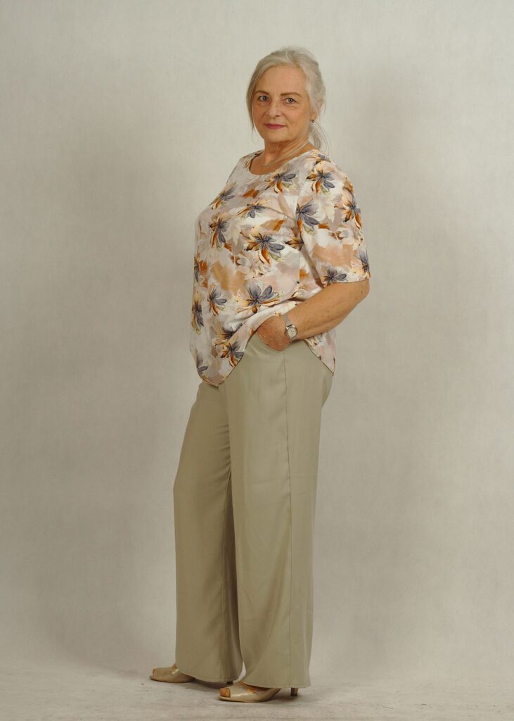 Klasyczny, jasny kolor wysmukla sylwetkę, a szeroki krój zapewnia swobodę ruchów i elegancki wygląd.