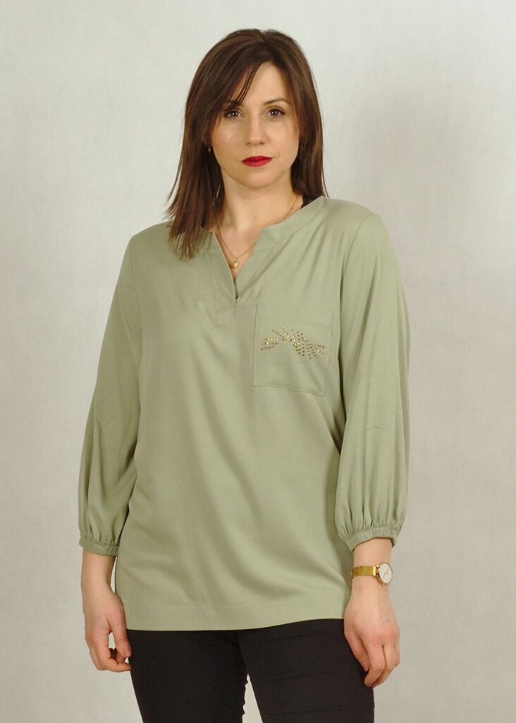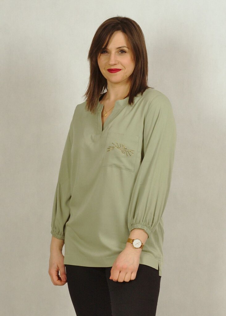 Jednokolorowa bluzka jest ciekawie ozdobiona kieszonką z delikatnym błyszczącym srebrnym nadrukiem.