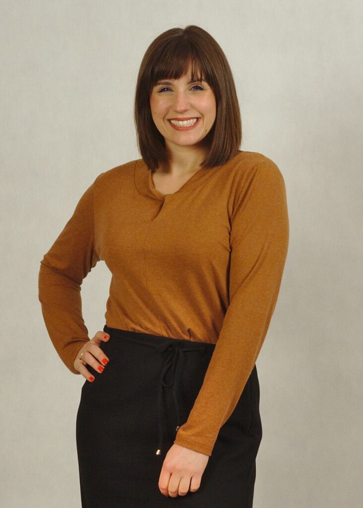 Musztardowa bluzka z ozdobnym dekoltem, to świetna baza do Twoich stylizacji.
