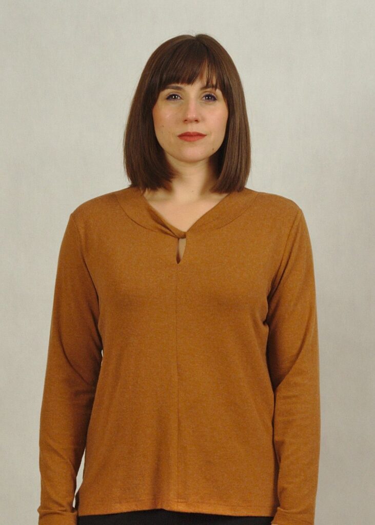Bluzka z łezką twory wyjątkowy dekolt. Wywinięcie subtelnie odkrywa szyję.