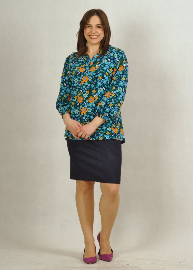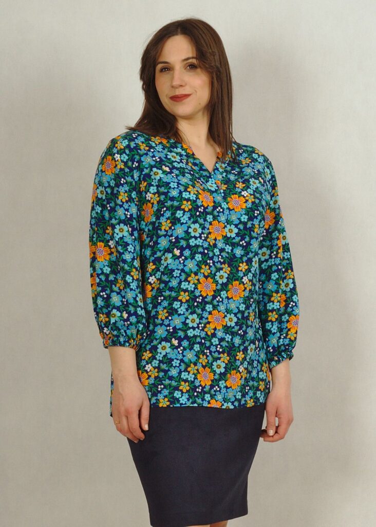 Bluzka ma dekolt z obszytym rewersem, który świetnie układa się na różnych typach sylwetek.