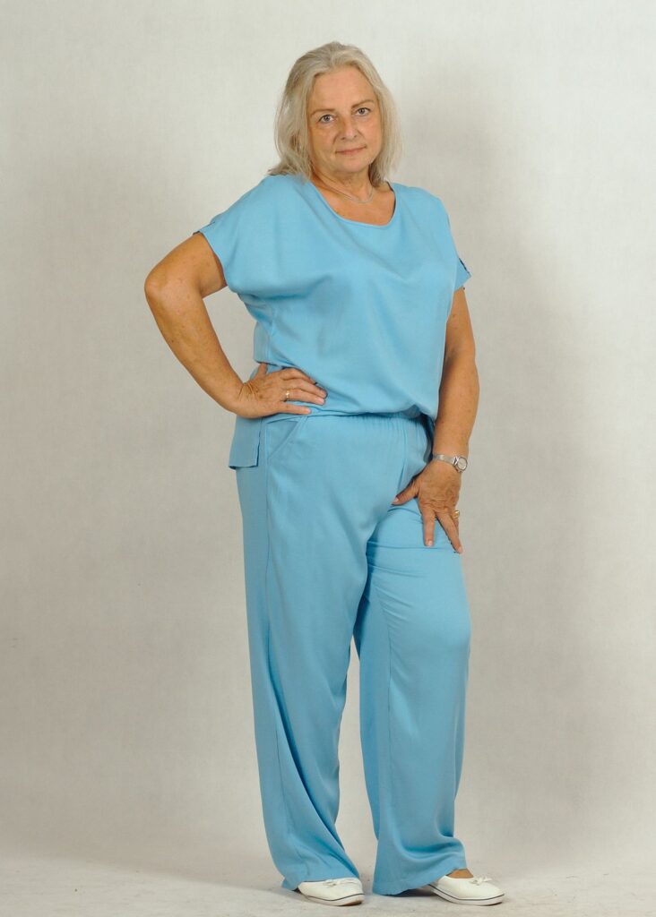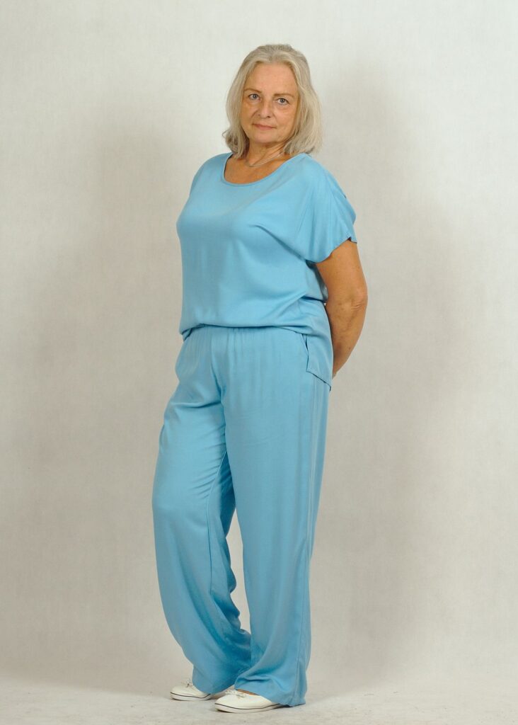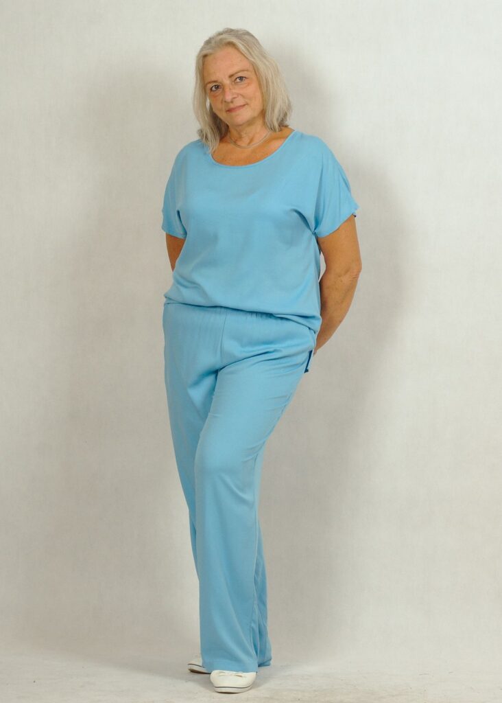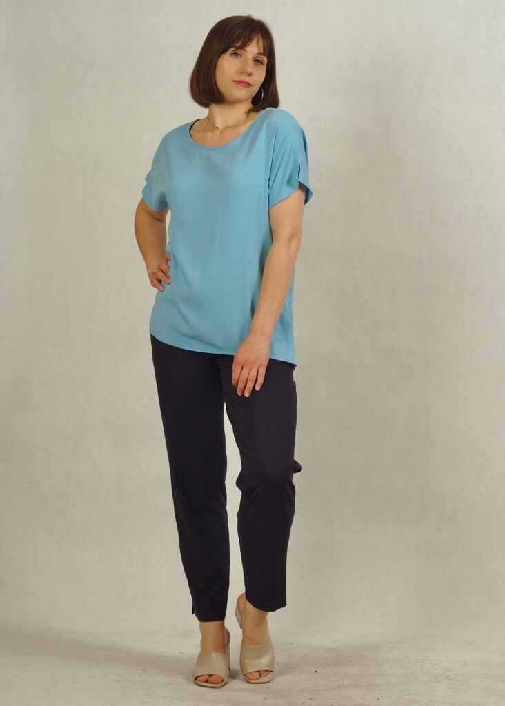 Bluzka doskonale sprawdzi się do spodni, zwłaszcza tych uszytych z tego samego materiału.