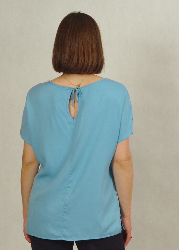 Bluzka ma lekko oversizowy krój, półokrągły dekolt, krótki rękawek z delikatnymi rozcięciami i śliczną łezkę z wiązaniem z tyłu.