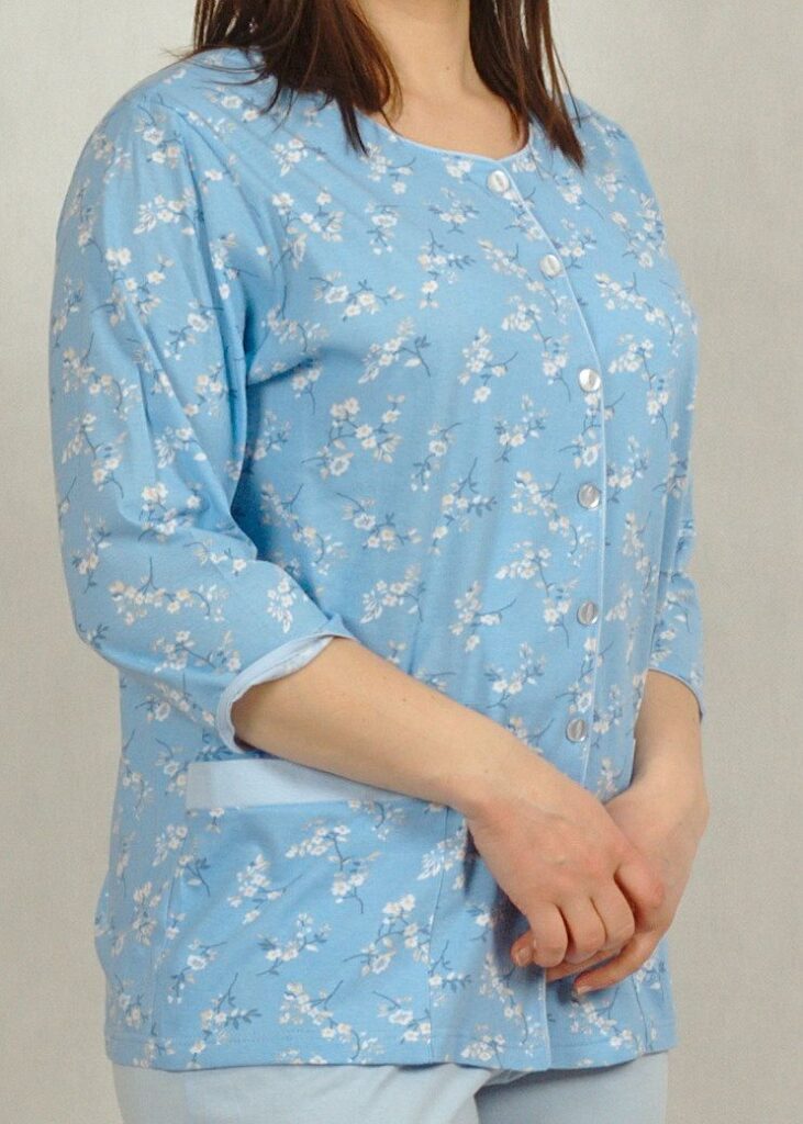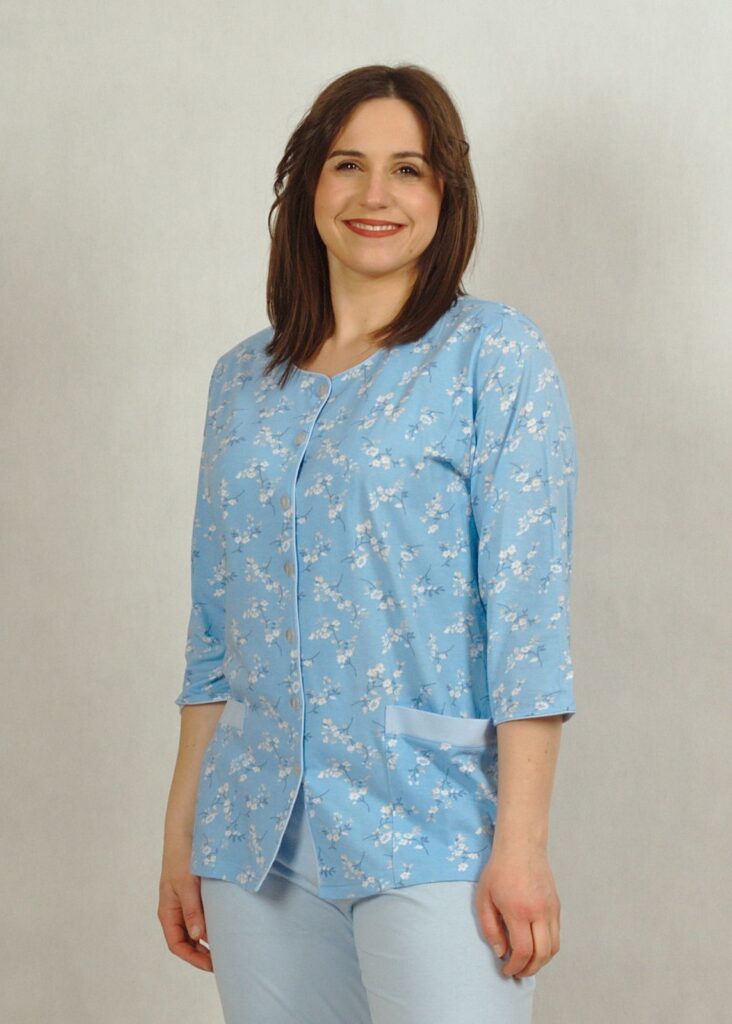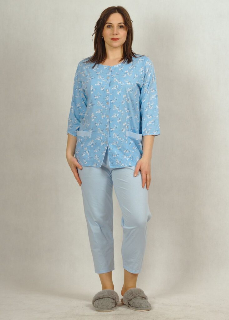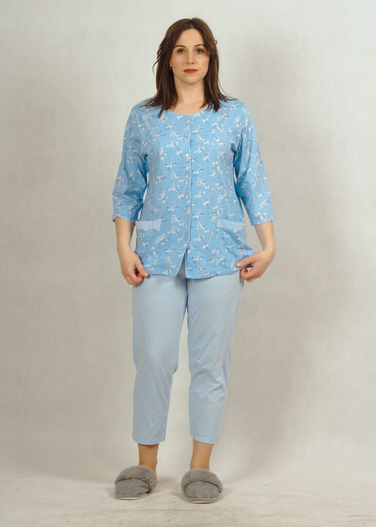 Piżama ma piękną niebieską kolorystykę – góra ma śliczny nadruk w kwiatki,a spodnie są jednokolorowe.