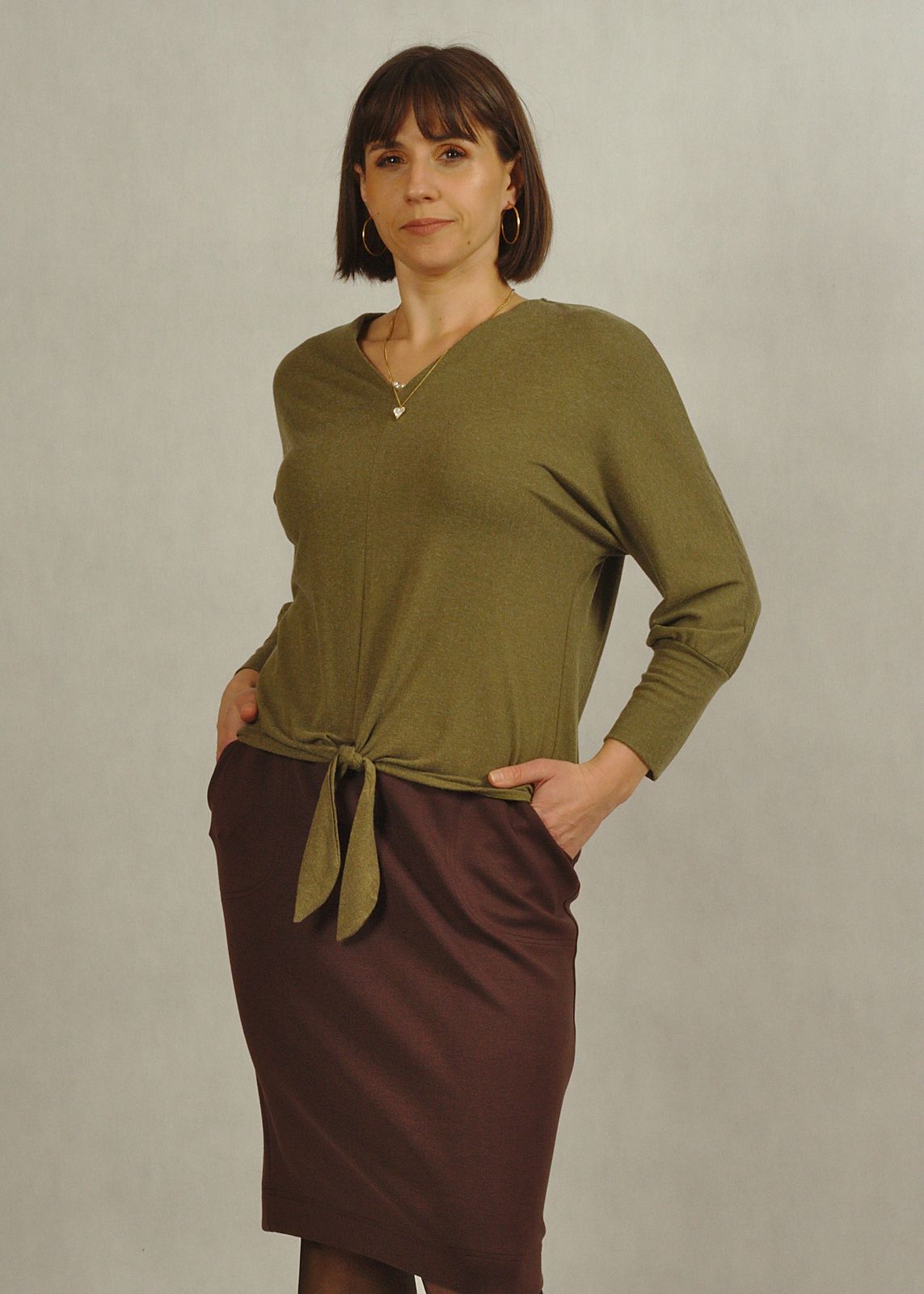 Oliwkowa bluzka to śliczna propozycja z wiązaniem w talii – świetny sposób na udaną stylizację.