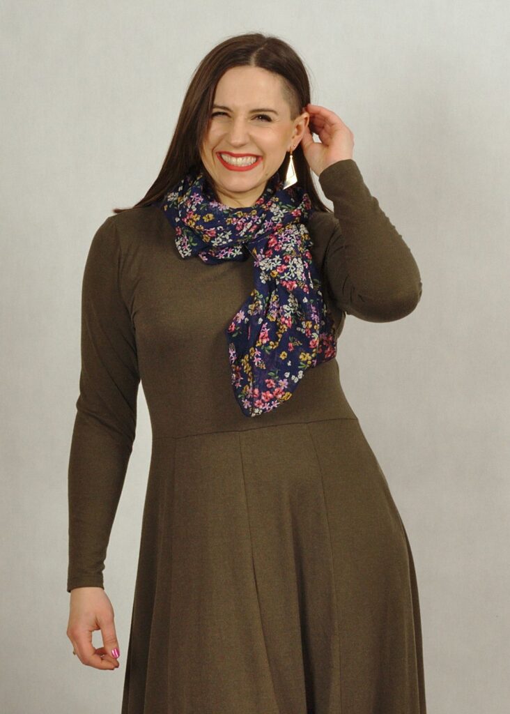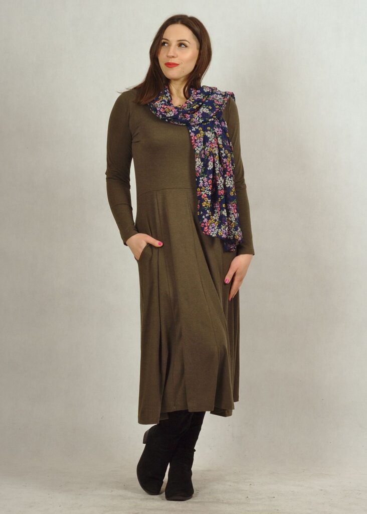 Sukienka ta jest świetną bazą pod każdy Twój pomysł na stylizacje. Długi rękaw i delikatny, półokrągły dekolt pozwolą połączyć ją np. z kolorowymi swetrami.