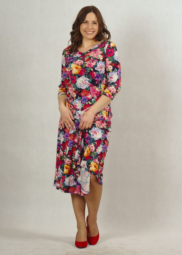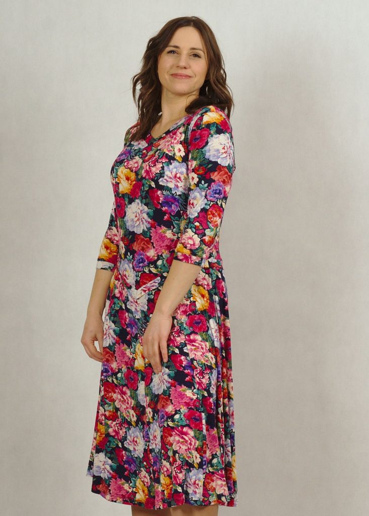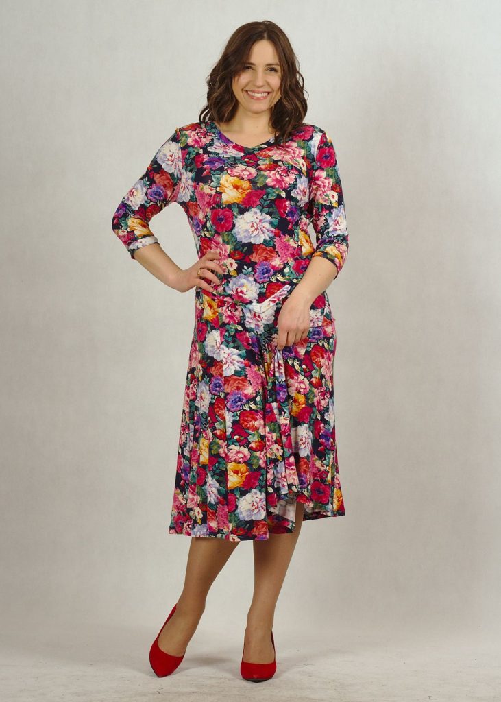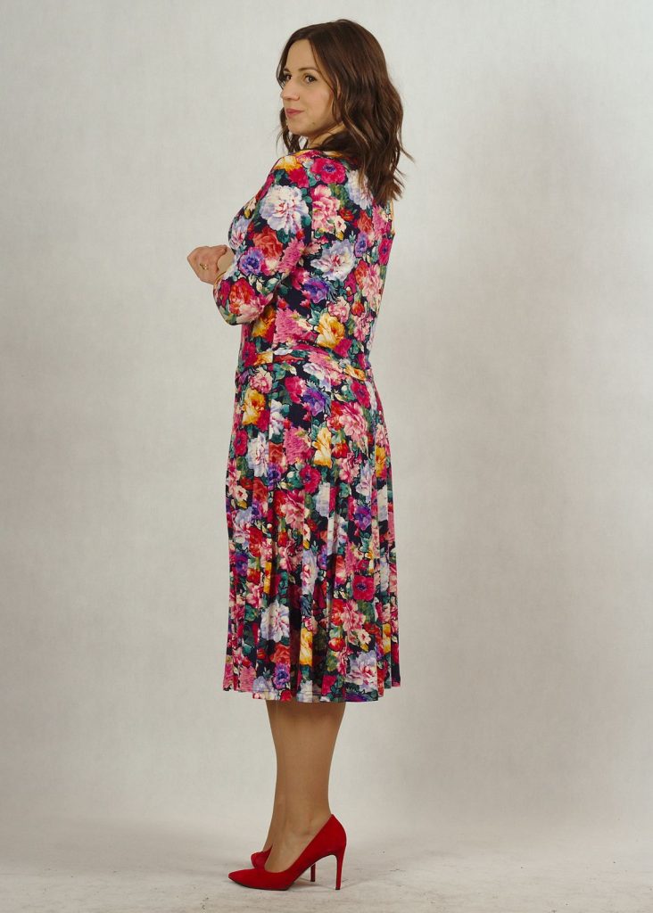 Dół sukienki lekko poszerzany, wyprofilowany cięciami.