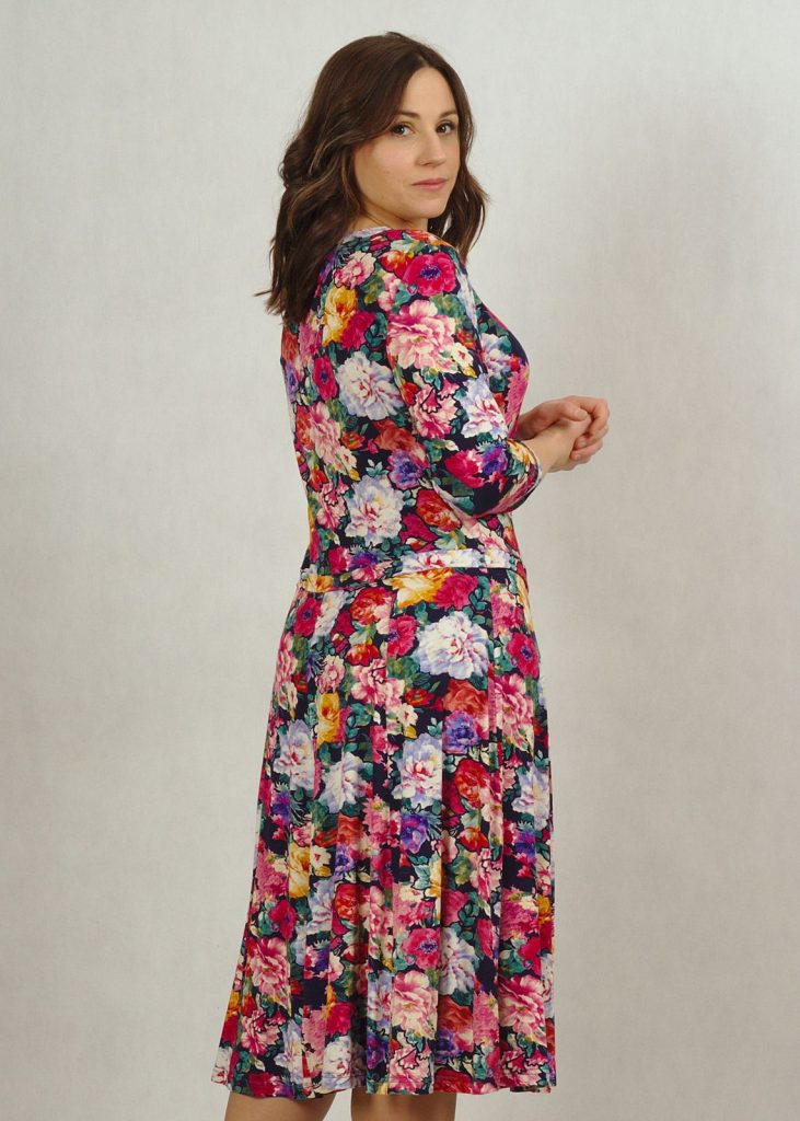 Góra sukienki jest prosta, klasyczna, z rękawem za łokieć i dekoltem w piękny serek.