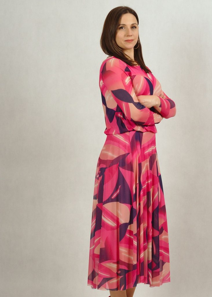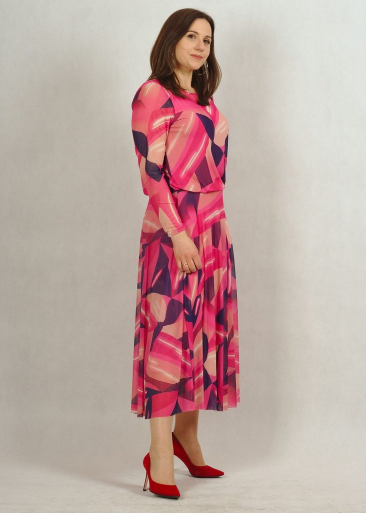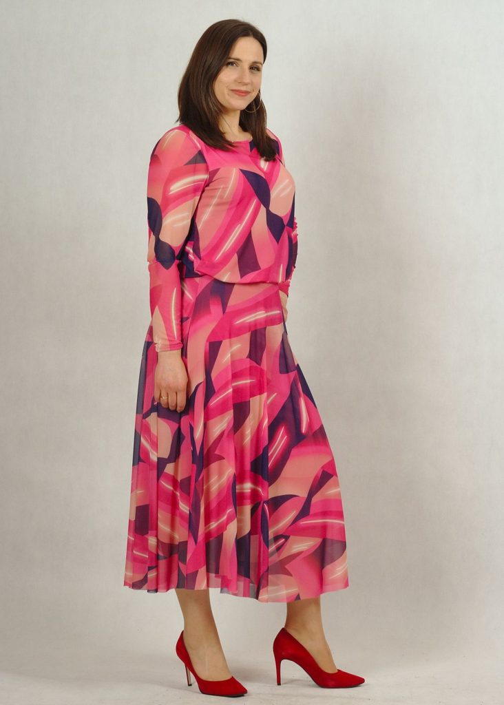 Sukienka z siatki ma podszewkę z wiskozy (100%!), dzięki czemu jest bardzo przyjemna w użytkowaniu. Podszewka jest w kolorze jasnego różu.