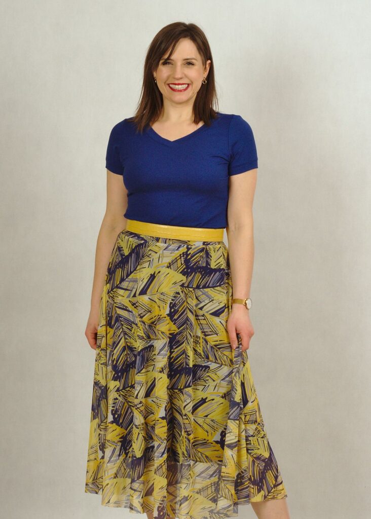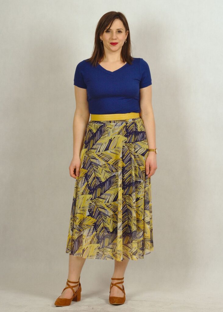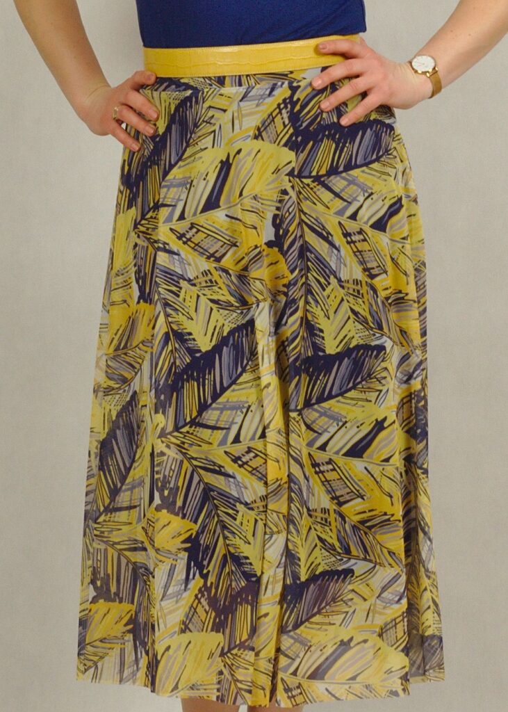 Długa spódnica składająca się z dwóch części – z wiskozowej podszewki z dzianiny oraz z poliestrowej siatki drukowanej.