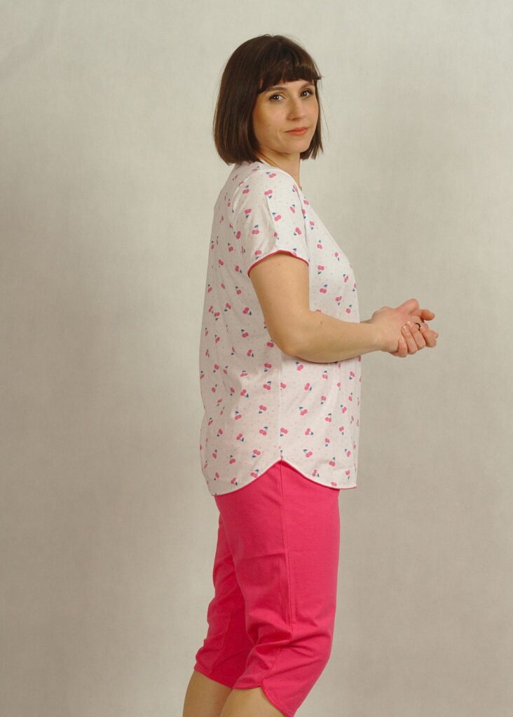 Piżama z krótkim rękawem, dokładnie obszytym lamówką.