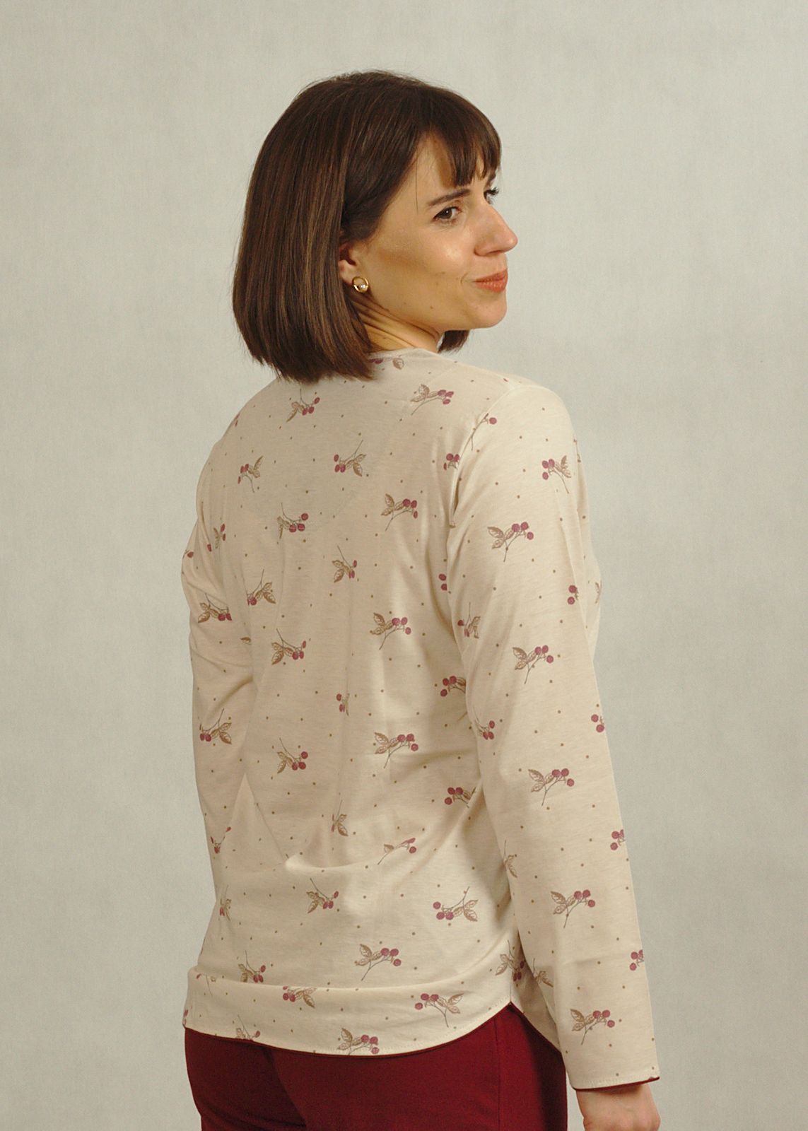 Góra piżamy ma prosty, klasyczny fason i ozdobiona jest nadrukiem.