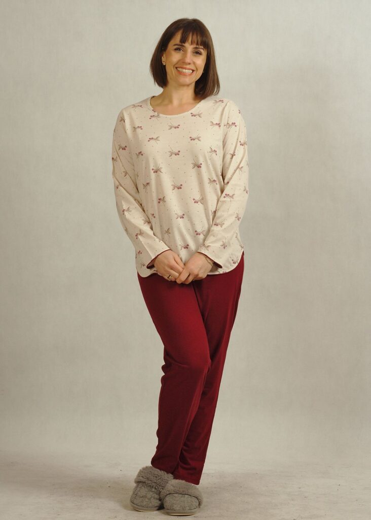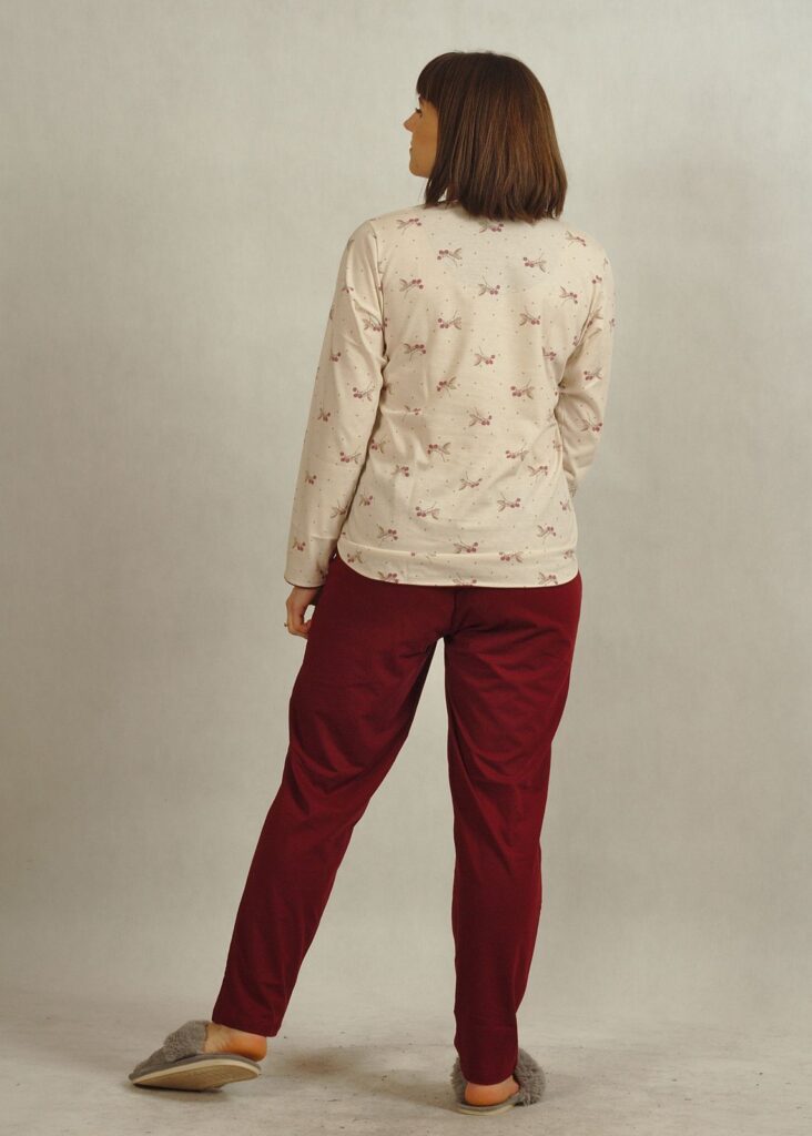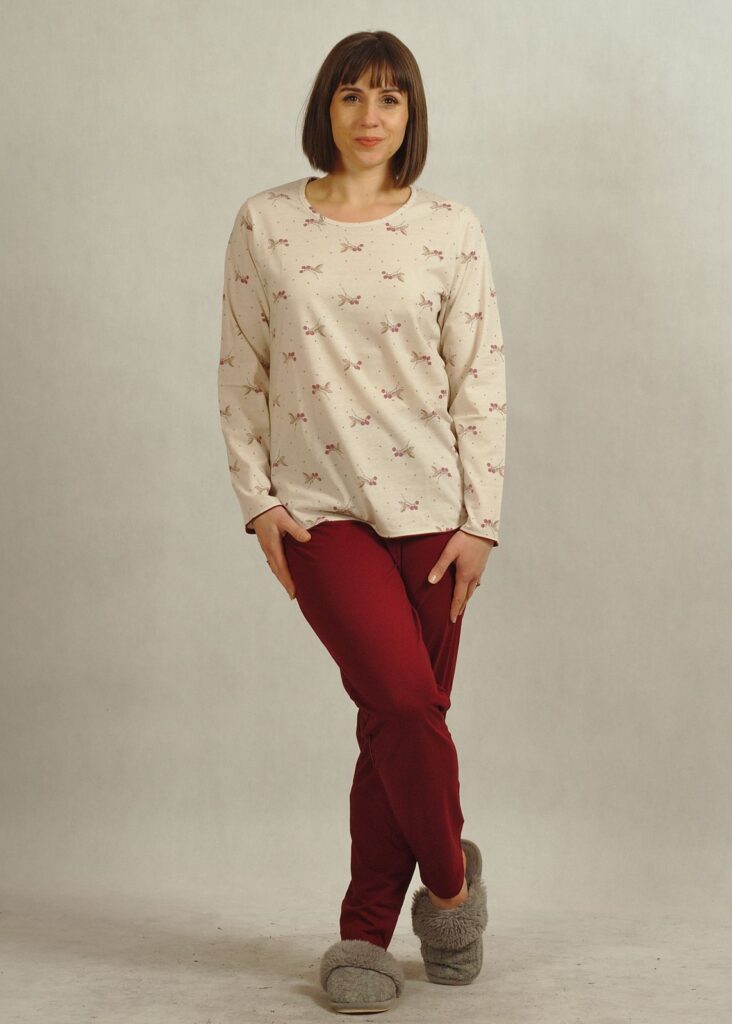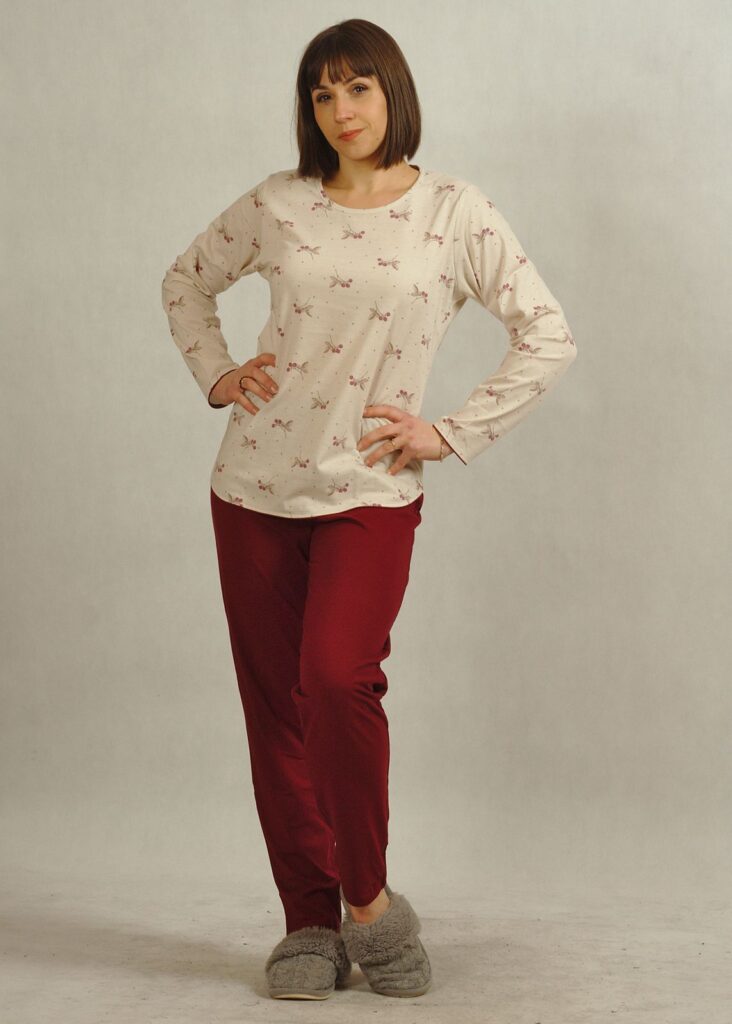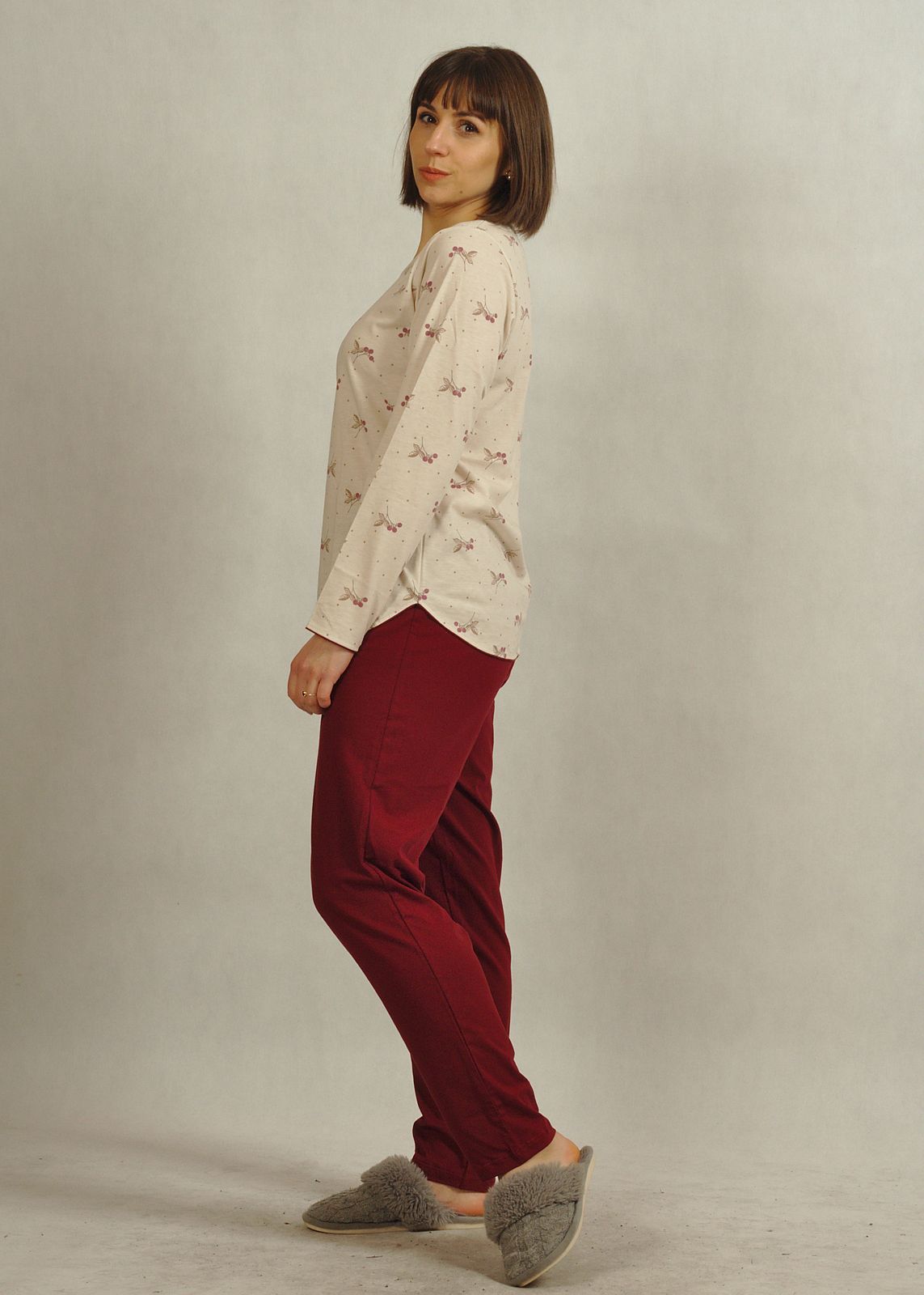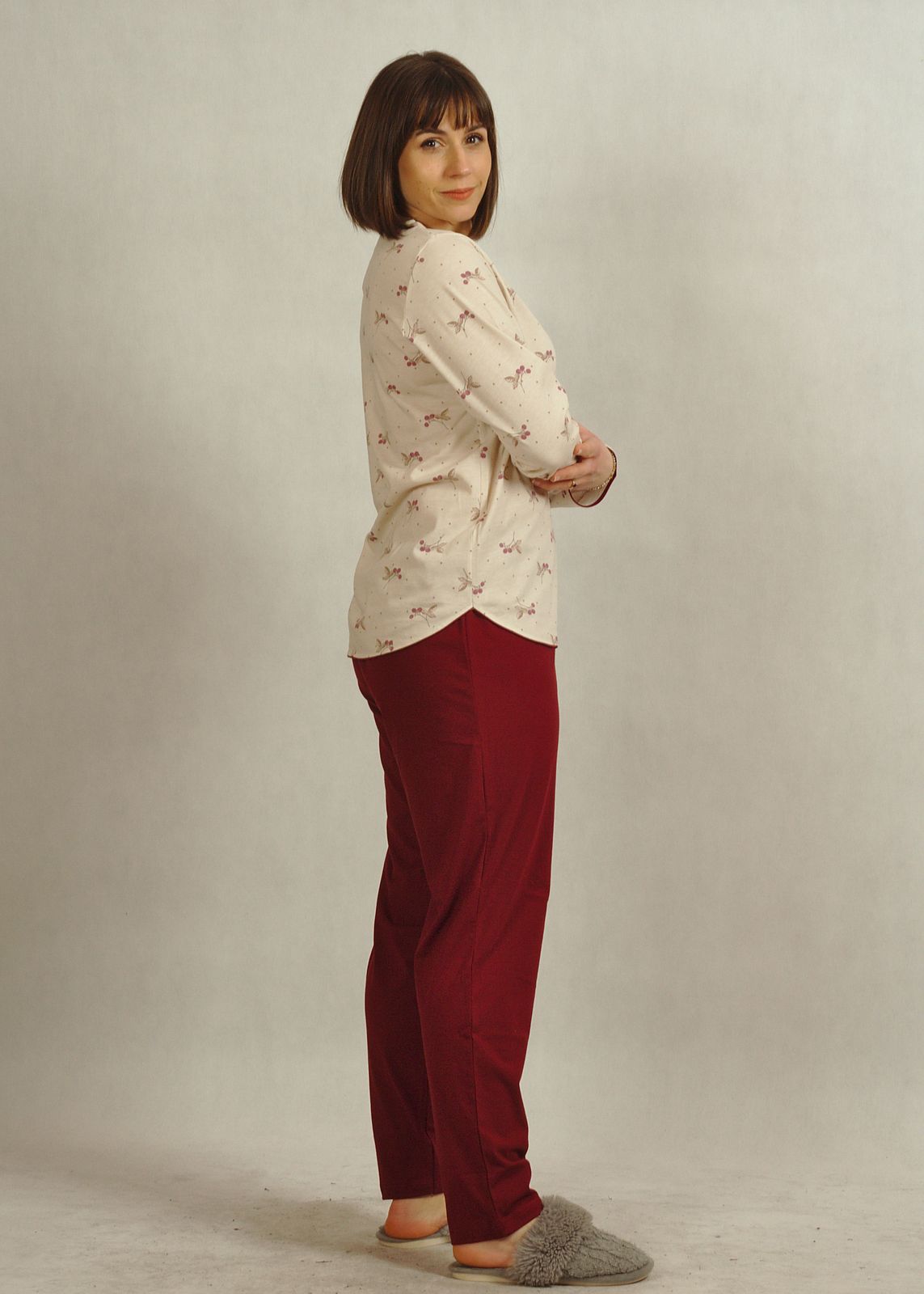 Śliczna bawełniana piżama ecru w kwiatki z bordowymi spodniami